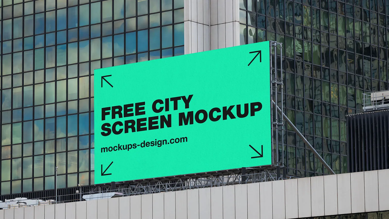 The Outdoor Horizontal Rectangular City Screen Mockup in Perspective View is a practical tool for visualizing your advertising billboard designs. This mockup allows you to see how your design would appear in a real urban setting, complete with towering buildings and sky reflections, providing a realistic backdrop for your project.