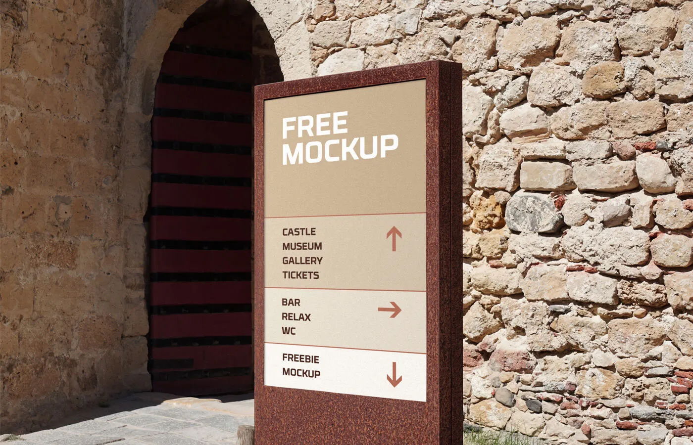The Outdoor Wayfinding Sign Mockup is ideal for displaying your signage designs or artwork in a realistic outdoor setting. This mockup features a 3/4 view of the sign, allowing you to clearly present the surface and details of your design. It offers a practical way to visualize how your work will appear in a real-world environment.