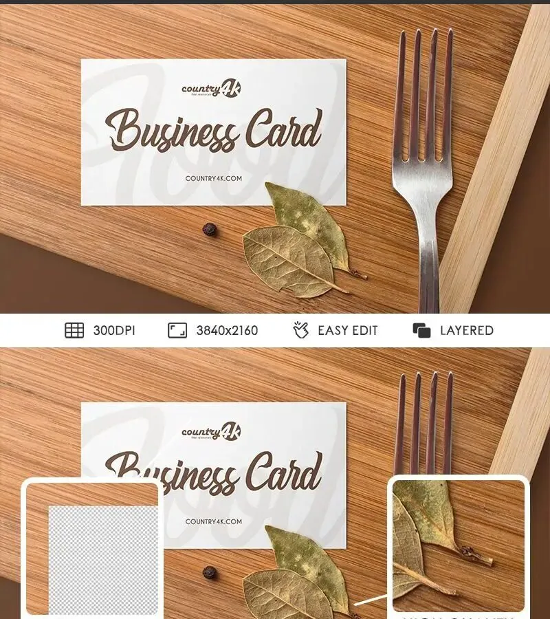 This mockup provides an overhead view of a business card placed on a wooden table, accompanied by a fork and two dried leaves. While it is ideal for displaying food branding designs due to its unique setting, it is versatile enough to showcase branding for other types of businesses as well.