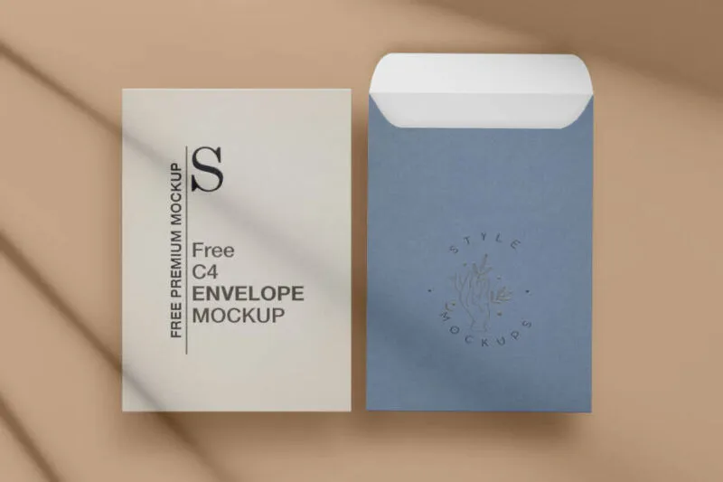This free resource allows you to display your designs on realistic C4 envelope models, featuring both front and back views. The overhead image captures the envelopes in a floating position, providing a clear view of your design work. One envelope is positioned to highlight the back design, while the other showcases the front illustrations.