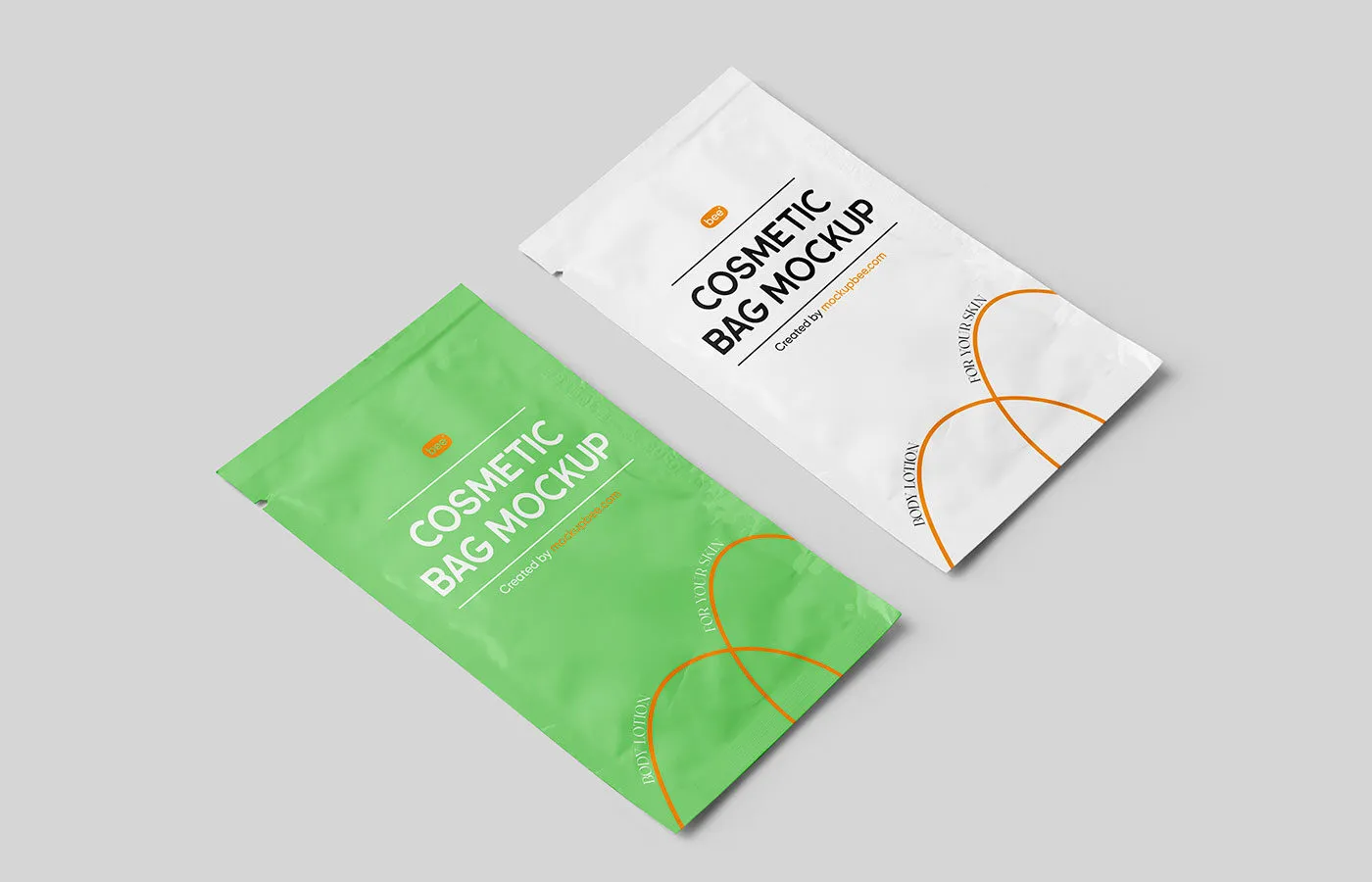 Showcase your sample-size or single-use product designs with elegance using this free perspective cosmetic pack. This high-resolution template renders sachets in a realistic angled view, perfect for presenting skincare, haircare, or sample-pack cosmetics in a professional, market-ready style.