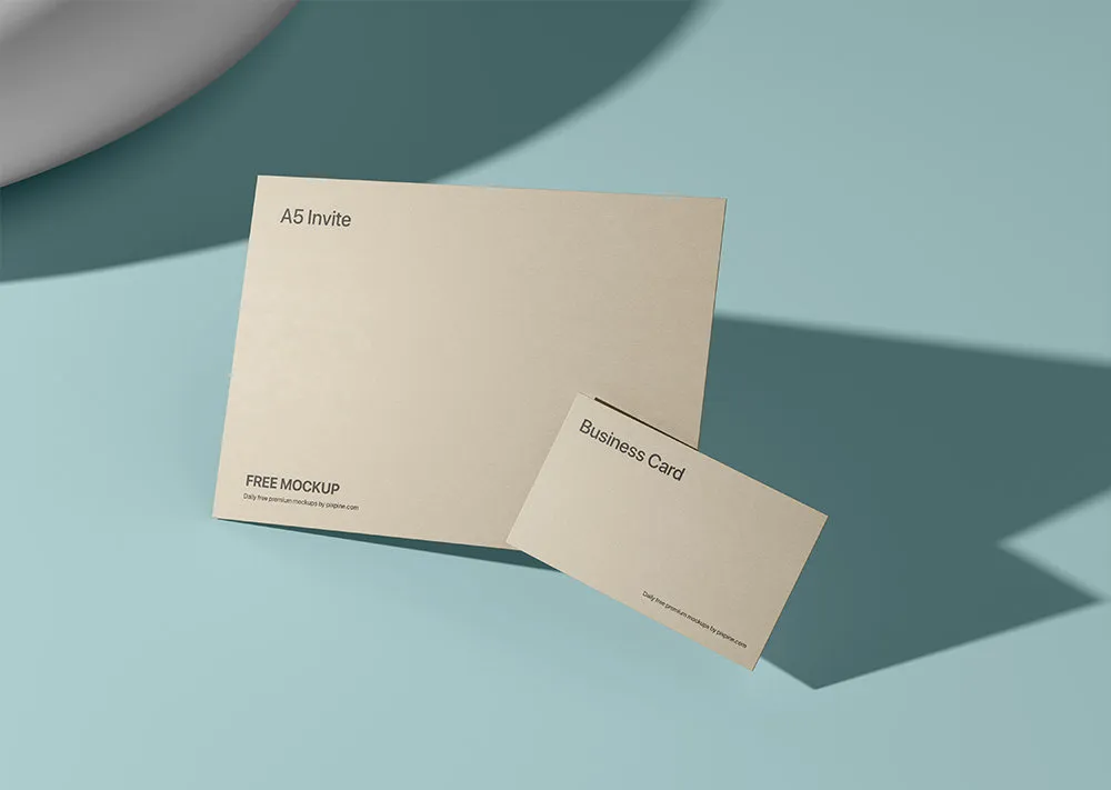 Perspective Shot of Business Card Mockup with A5 Invite Card