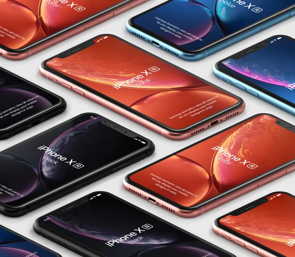 If you are looking for an iPhone XR mockup, this Perspective View iPhone XRS on Floor in Grid Style Mockup is a convenient option. It features multiple iPhone XRS models in coral, black, and blue, all laid out neatly on the floor with their screens facing upward.