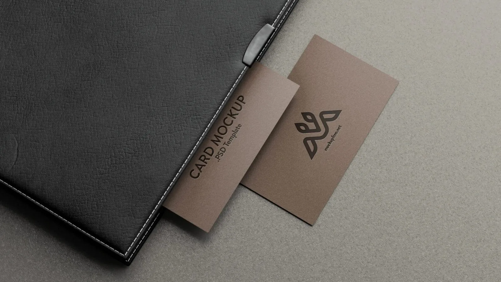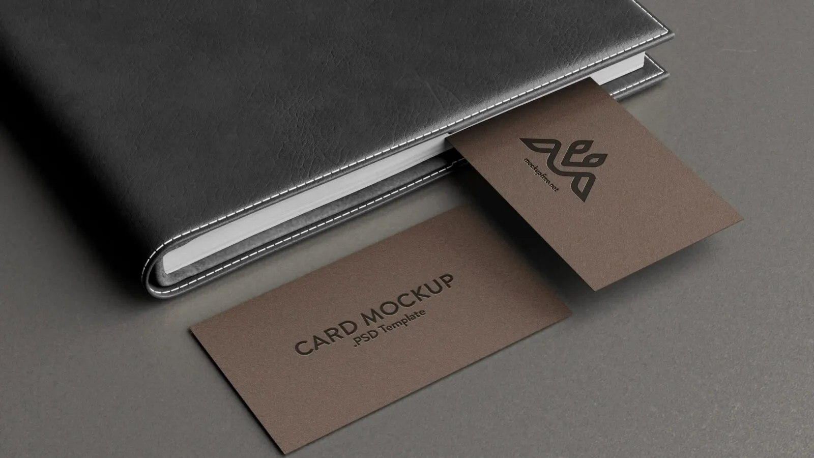 Perspective View of 5 Business Cards Mockups with Leather Cover Book