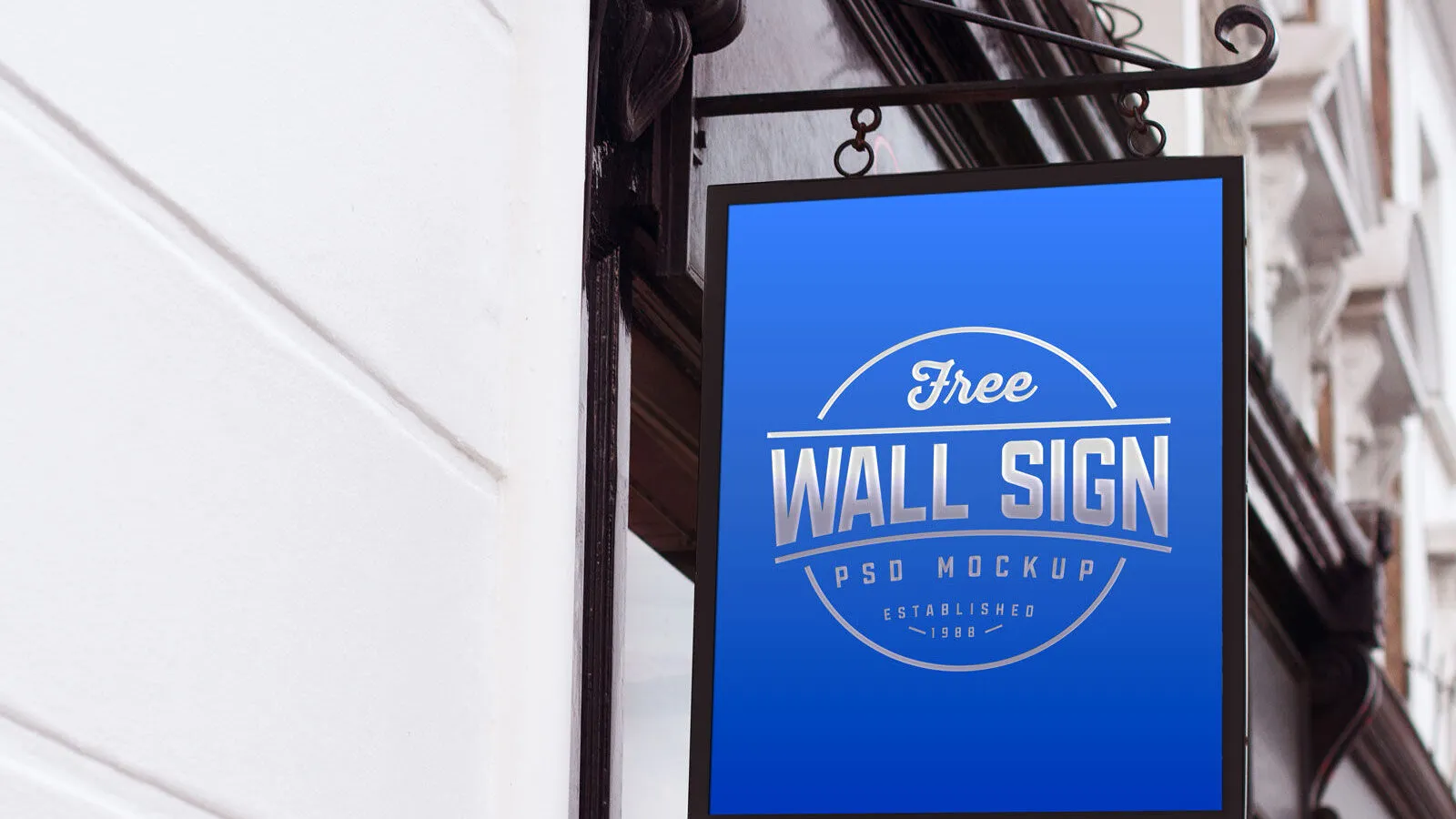 Explore the Perspective View of a Classic Wall Mounted Sign Mockup, designed to provide a realistic representation of your wall sign designs. This mockup features a sign mounted against a shop door’s wall, complete with a decorative wrought iron element that adds an aesthetic touch. The background is crafted to help you visualize your final design in a real-world setting before production.