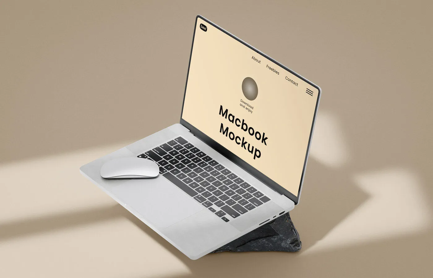 The Perspective View of MacBook Mockup with Mouse offers a realistic and engaging way to display your design projects. The interplay of light and shadow creates a visually appealing setting, making it an ideal choice for showcasing your latest design with a contemporary touch.