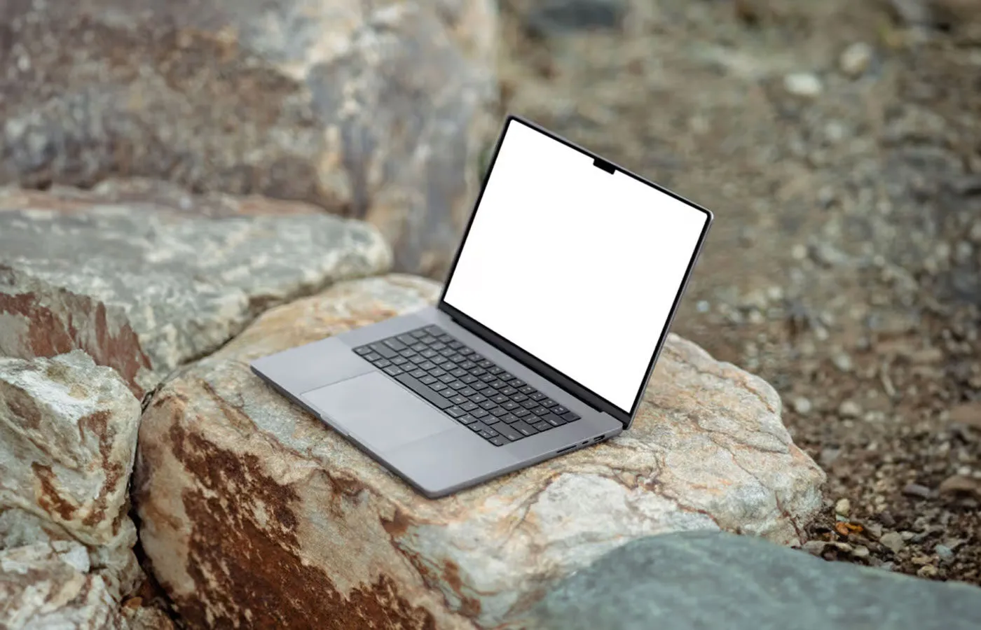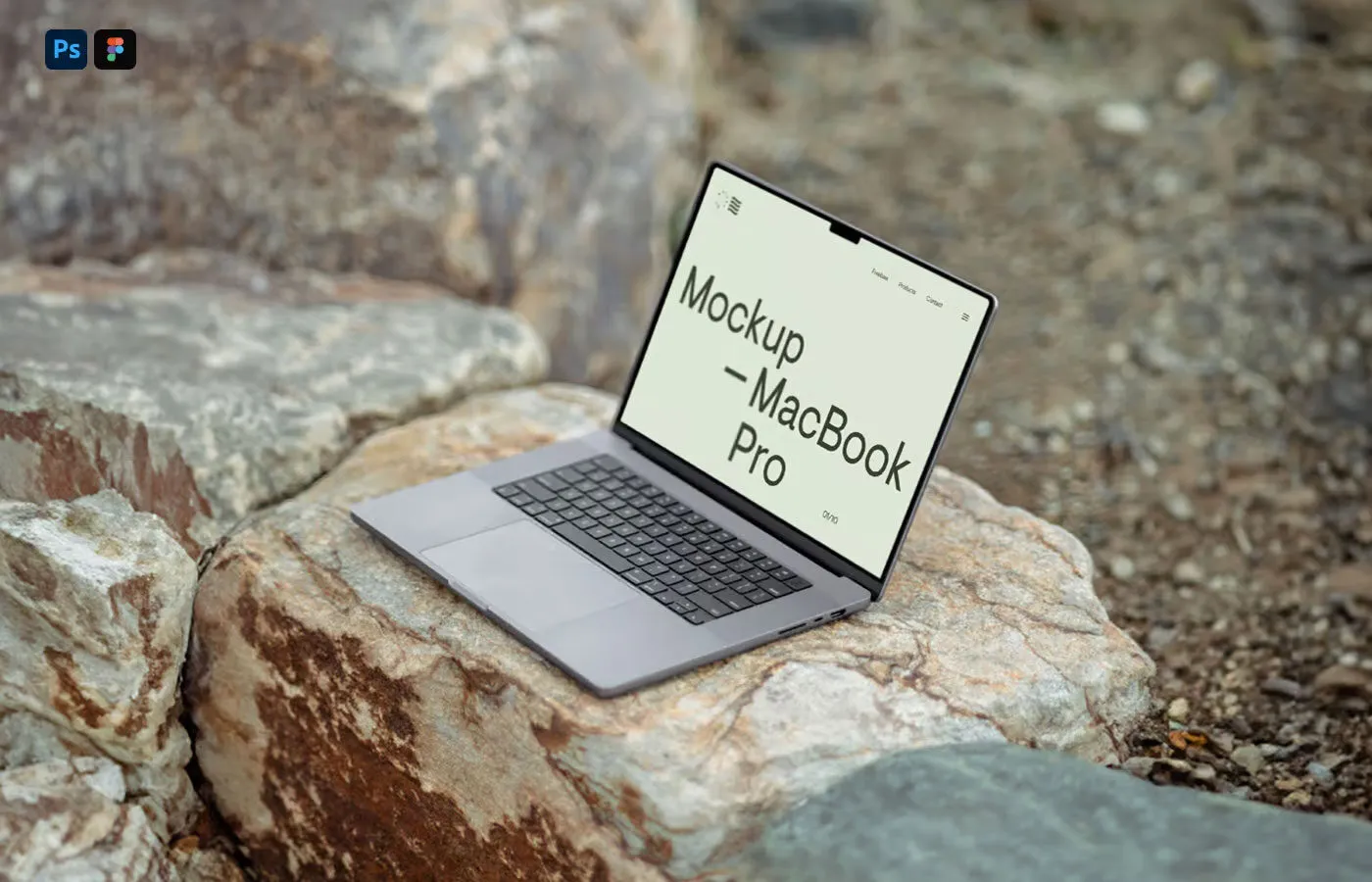 Discover a distinctive MacBook Pro mockup set against a natural rock backdrop. This realistic setting provides an engaging visual experience that will capture the interest of many viewers.