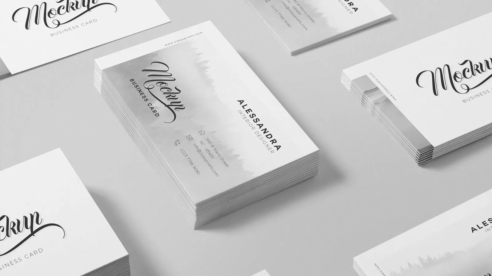This mockup allows you to showcase your business card designs from multiple angles, providing a comprehensive view of your work. It features various card models positioned in both landscape and portrait orientations, enabling a clear display of your design from different perspectives.
