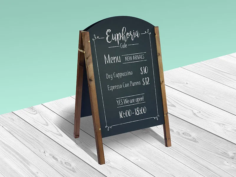Using an A-frame chalkboard to feature menus of cafes, restaurants, and fast food businesses is trendy. They put this chalkboard in an outdoor environment, and everybody can see the available foods and drinks along with their prices.