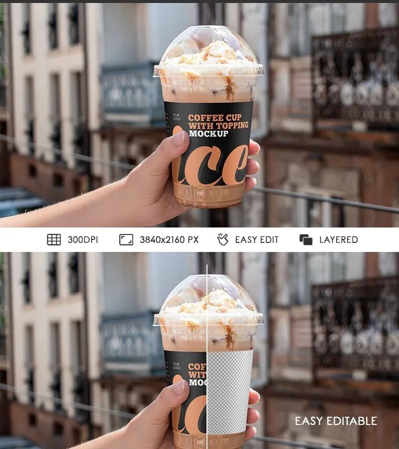 The download includes a PSD file featuring a clear plastic cup of iced coffee topped with cream and covered with a lid. The design highlights a hand holding the cup from the front view, set against a blurred cityscape background that adds vibrancy to the scene. The coffee cup is wrapped in a shrink sleeve, allowing you to easily display your brand logo and information using smart objects.