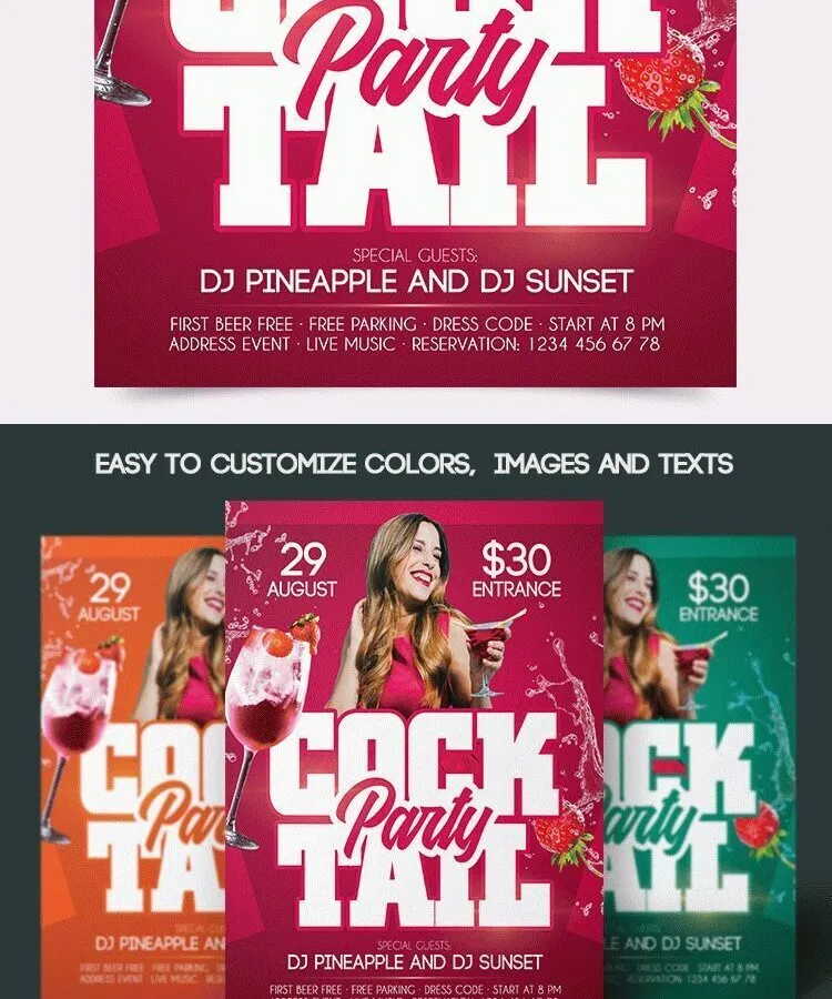The flyer features eye-catching elements like water splashes, a spirit glass, and strawberries that create a memorable impression for your guests. It includes a model that you can easily replace with your own image using smart layers, making customization simple. Enjoy the ease of setting up your event with this user-friendly design.