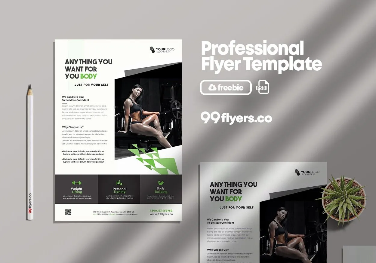 Take this awesome , for instance. It offers a neat layout so that you can promote your gym professionally. Thanks to the 99Flyers, it’s totally suitable for advertising other professions too. It provides a large spot for the image element and lots of room for text. So as long as you download the file, you can insert your information and it’ll do the trick.