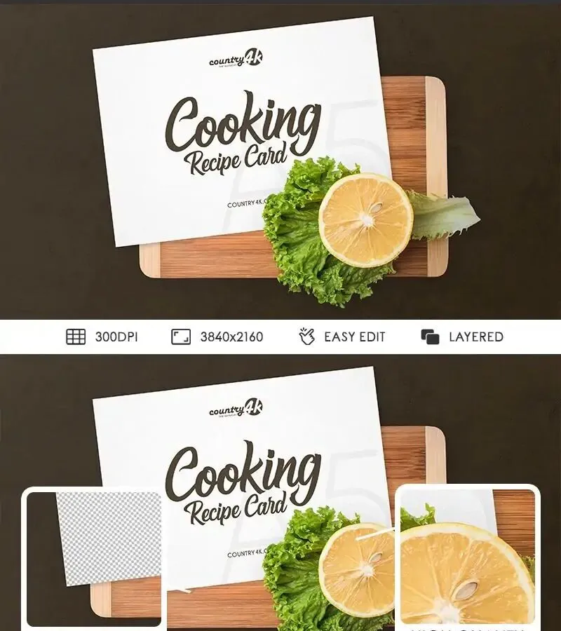 Cooking recipe cards are all used by both chefs and people that would like to cook something special! In this mockup, there is a lovely delicious crinkly leaf of lettuce with half a lemon on it that would make anybody hungry and interested to see what’s on the white recipe card. There is a chopping board that makes it more realistic!
