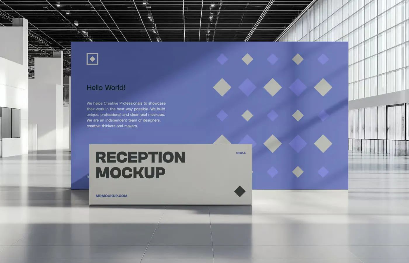 The Reception in the Modern Building Mockup provides a sophisticated setting for showcasing corporate branding, office signage, or architectural design concepts. This high-resolution mockup features a sleek and contemporary reception area where your logo or artwork can be displayed. The realistic lighting and clean lines of the upscale interior enhance the professional look and visual appeal of your presentation.