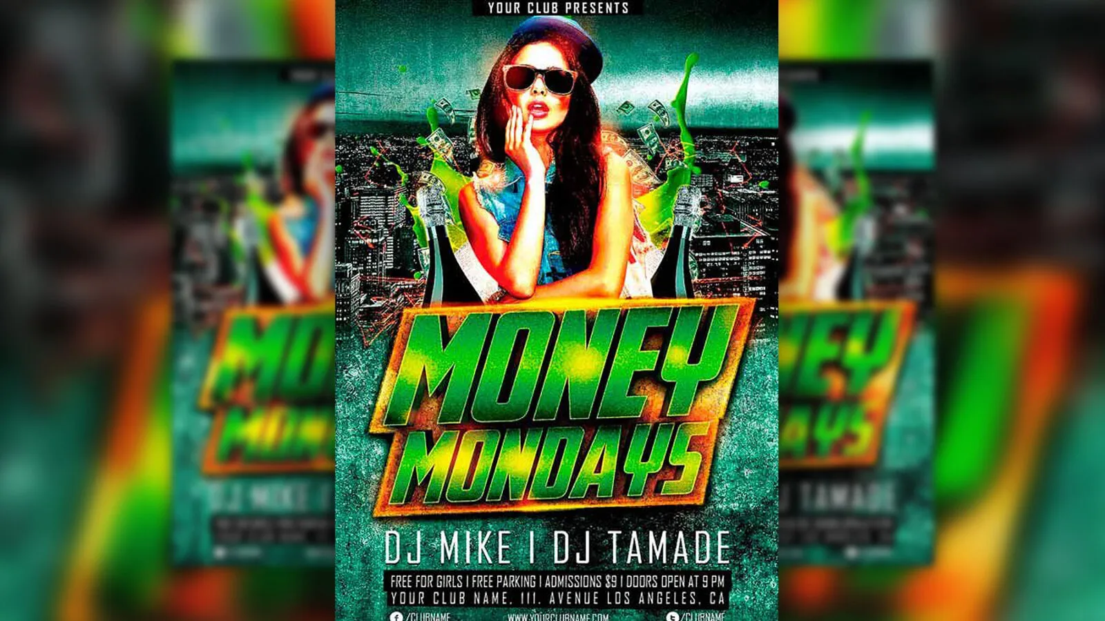 The design features a stunning city landscape in the background, providing an eye-catching backdrop. There is a large image placeholder at the top where you can insert your own model image. The title box is customizable to announce your event, and the footer is pre-set for essential details like cover charges and the club’s address. This template makes creating an appealing and informative flyer straightforward.