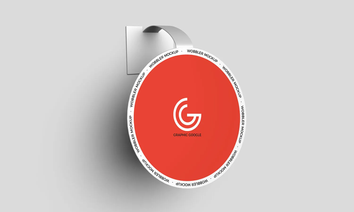 This mockup showcases a round advertising wobbler attached to a solid surface, perfect for highlighting your brand in a retail setting. When products are lined up on a shelf, the ones with eye-catching features tend to attract more attention. An advertising wobbler can be an effective tool to make your product stand out among similar items.