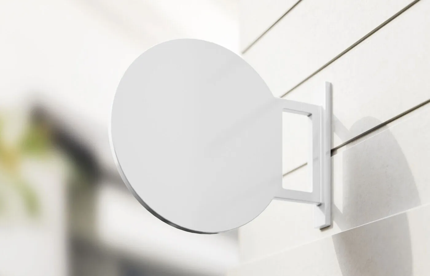 The Round Logo Signage Mockup in the Half-Side View Outdoors allows you to present your logo designs and other artworks in a realistic setting. This mockup features a round metal sign mounted on a striped wall outdoors, capturing a half-side view with a blurred background to emphasize the signage. The design includes a diffracted shadow, adding depth to your presentation.