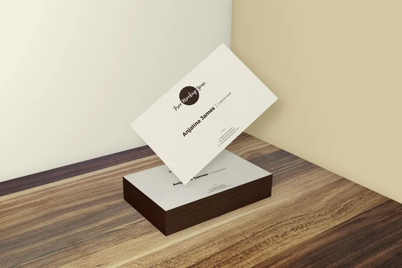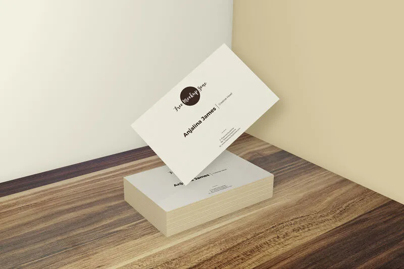 The wooden floor background adds warmth to the overall design. This mockup is available in PSD format, allowing you to easily customize wall colors and business card colors and insert your own design using smart-object layers. It’s an ideal tool to showcase your professional business card designs with an executive appearance.