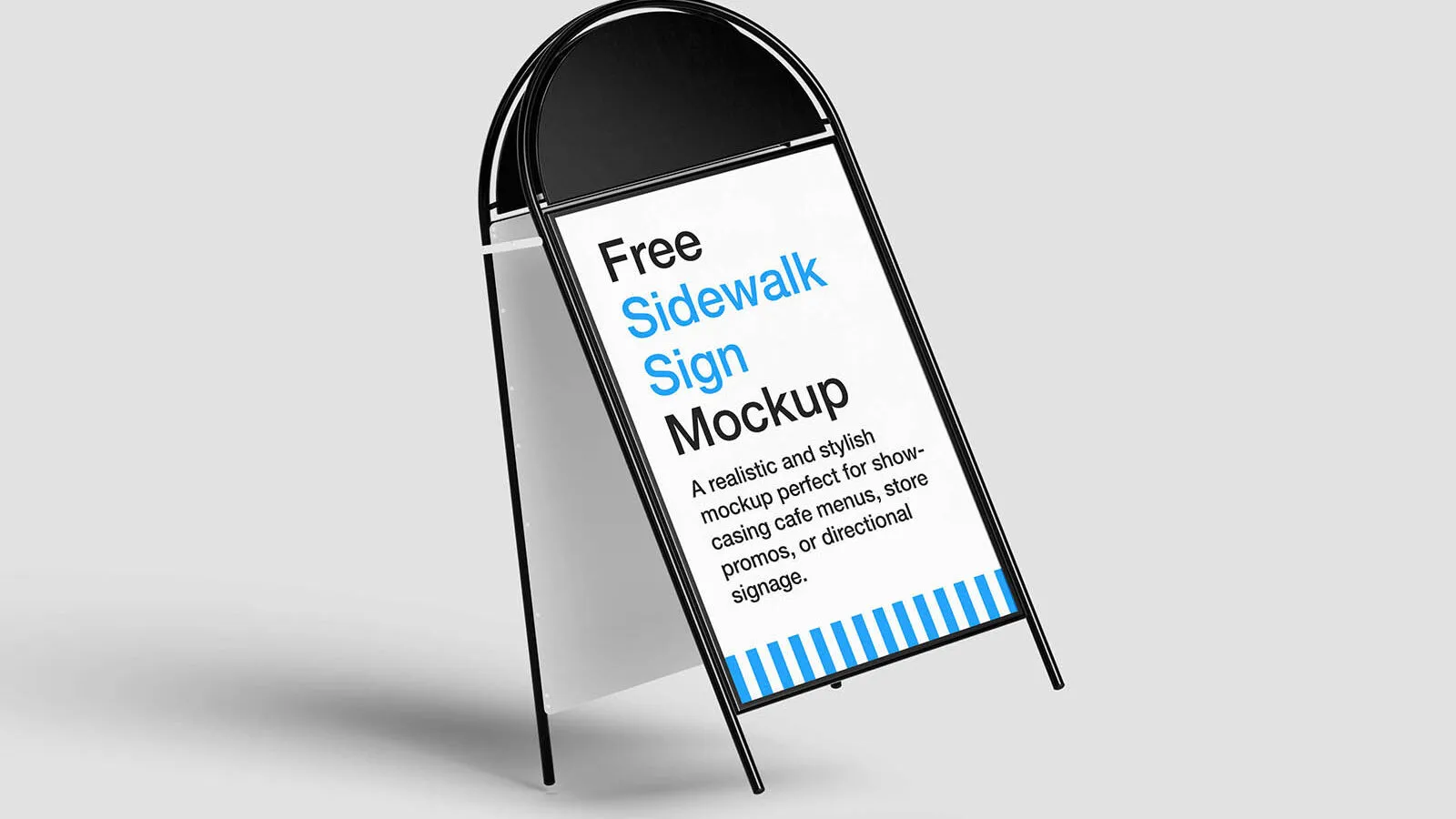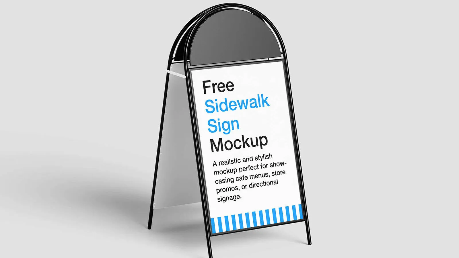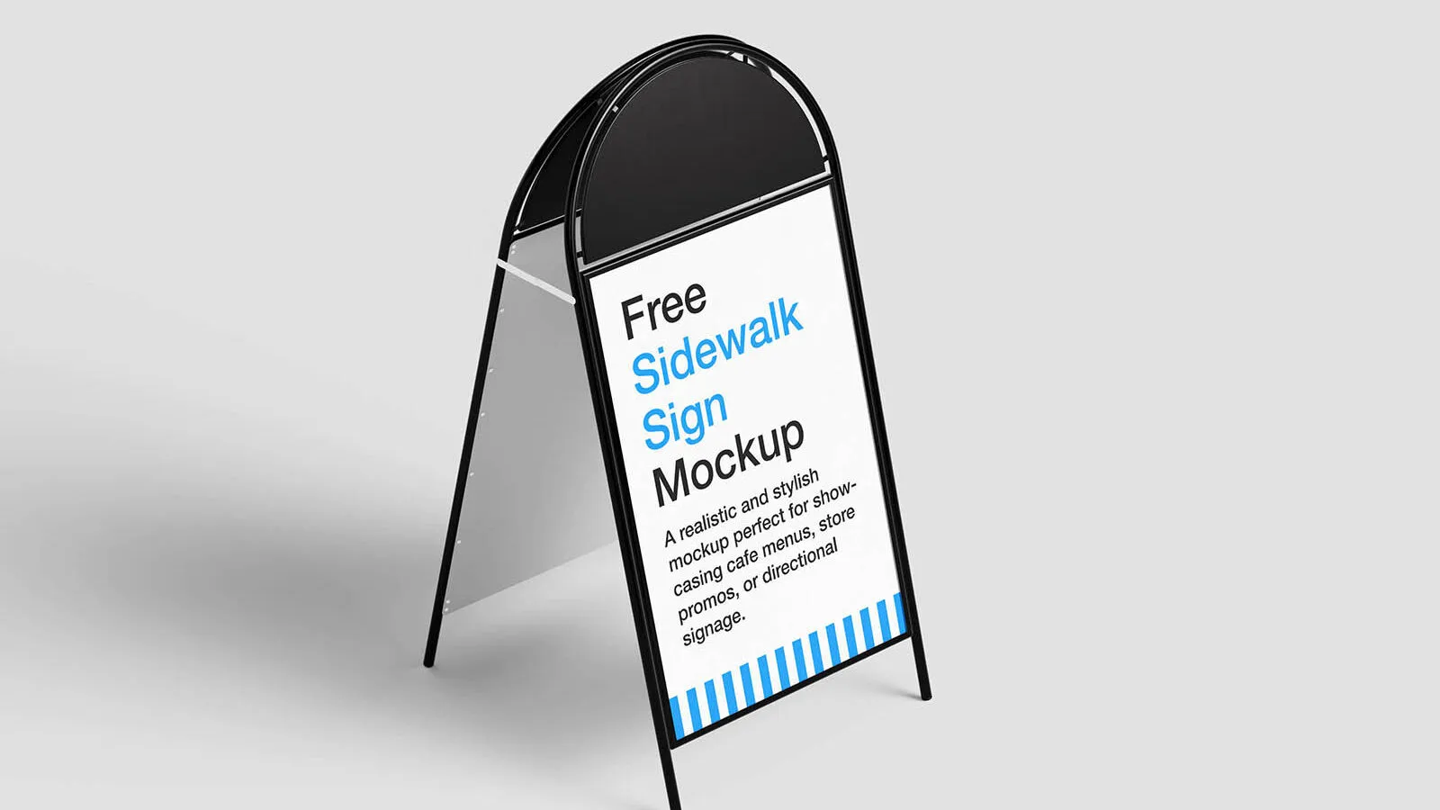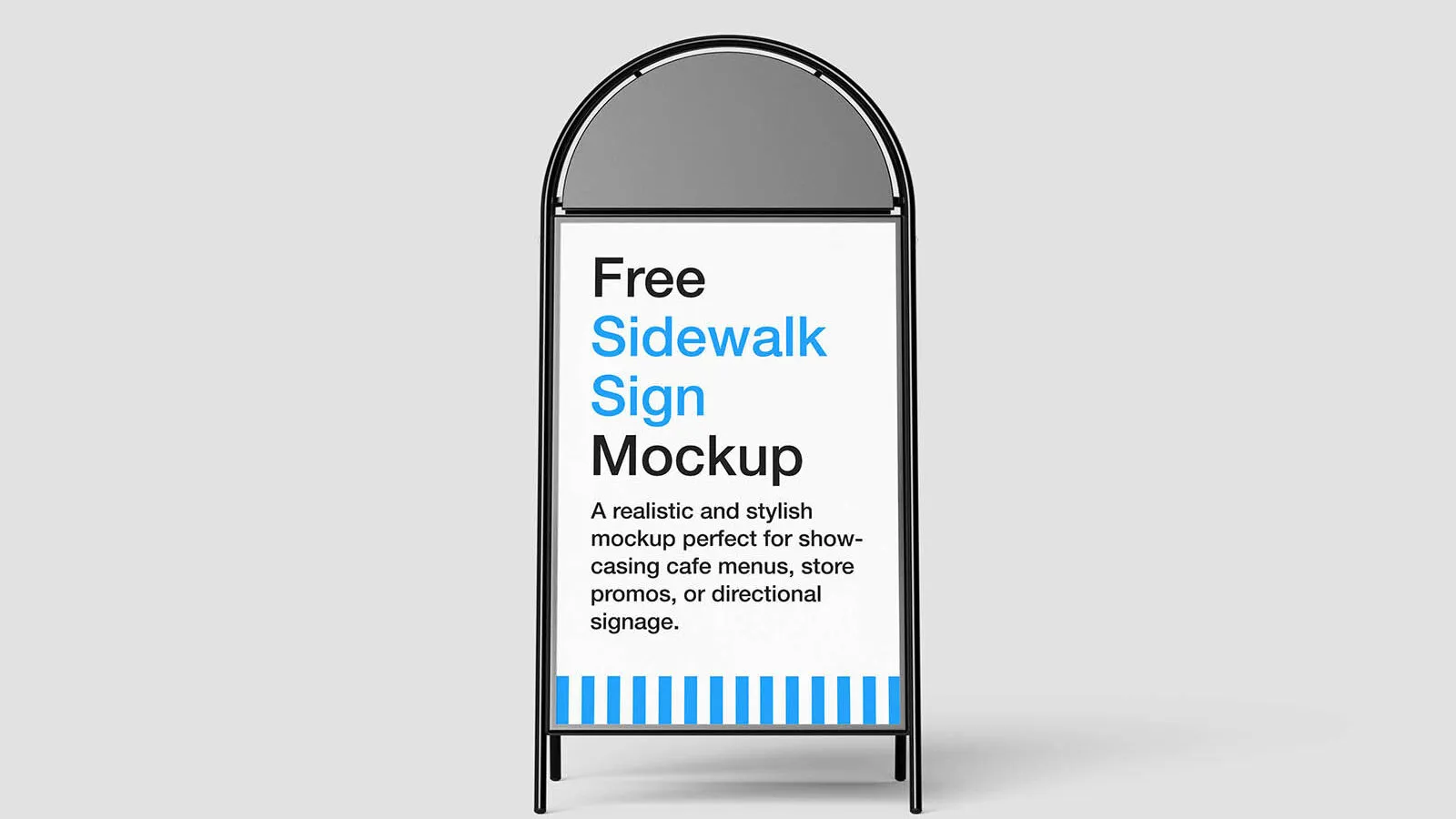 Deliver your signage designs with flair using a stylish sidewalk ! This free PSD package includes four professionally lit scenes, front-facing and angled, offering versatile views to present your artwork with maximum impact. The mockup’s rounded-top frame brings a contemporary, friendly vibe, perfect for cafés, boutique shops, retail stores, or wayfinding signage.