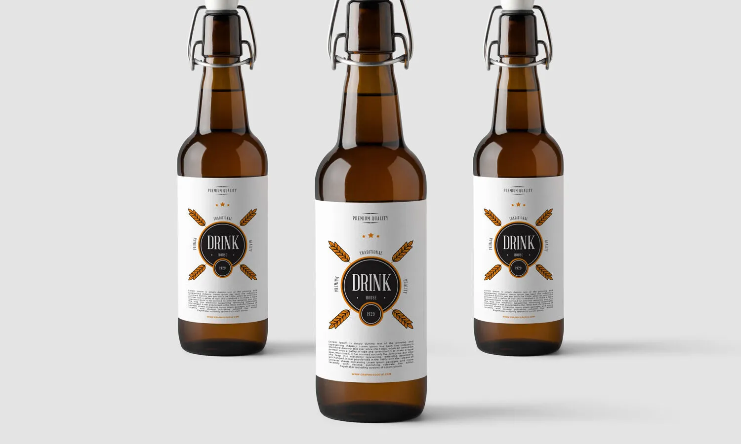 This mockup features three amber glass beverage bottles with flip-top stoppers, providing a realistic way to visualize your design. It allows you to explore different design ideas and see how they would look on actual bottles, helping you make informed decisions for your brand’s packaging.