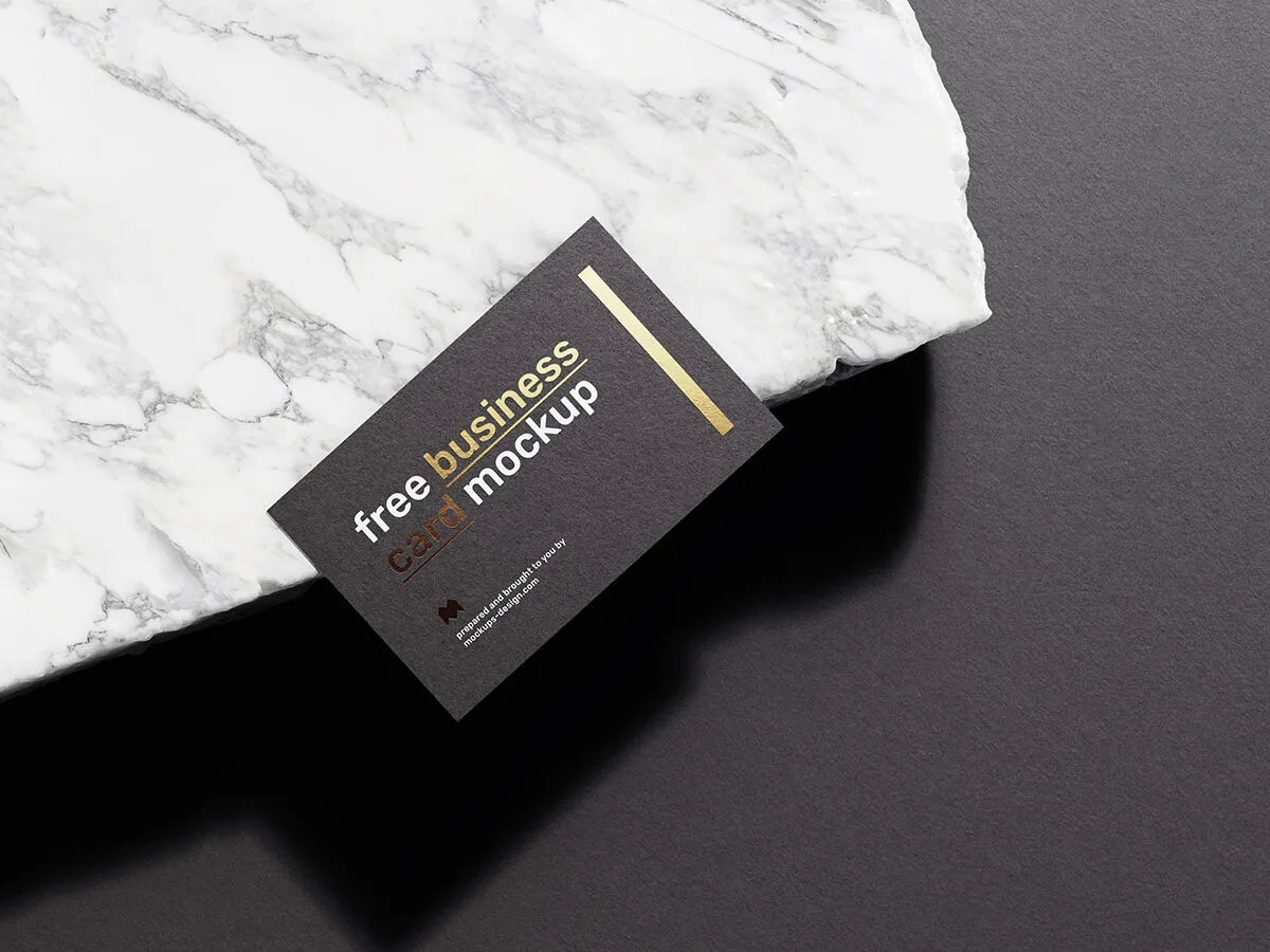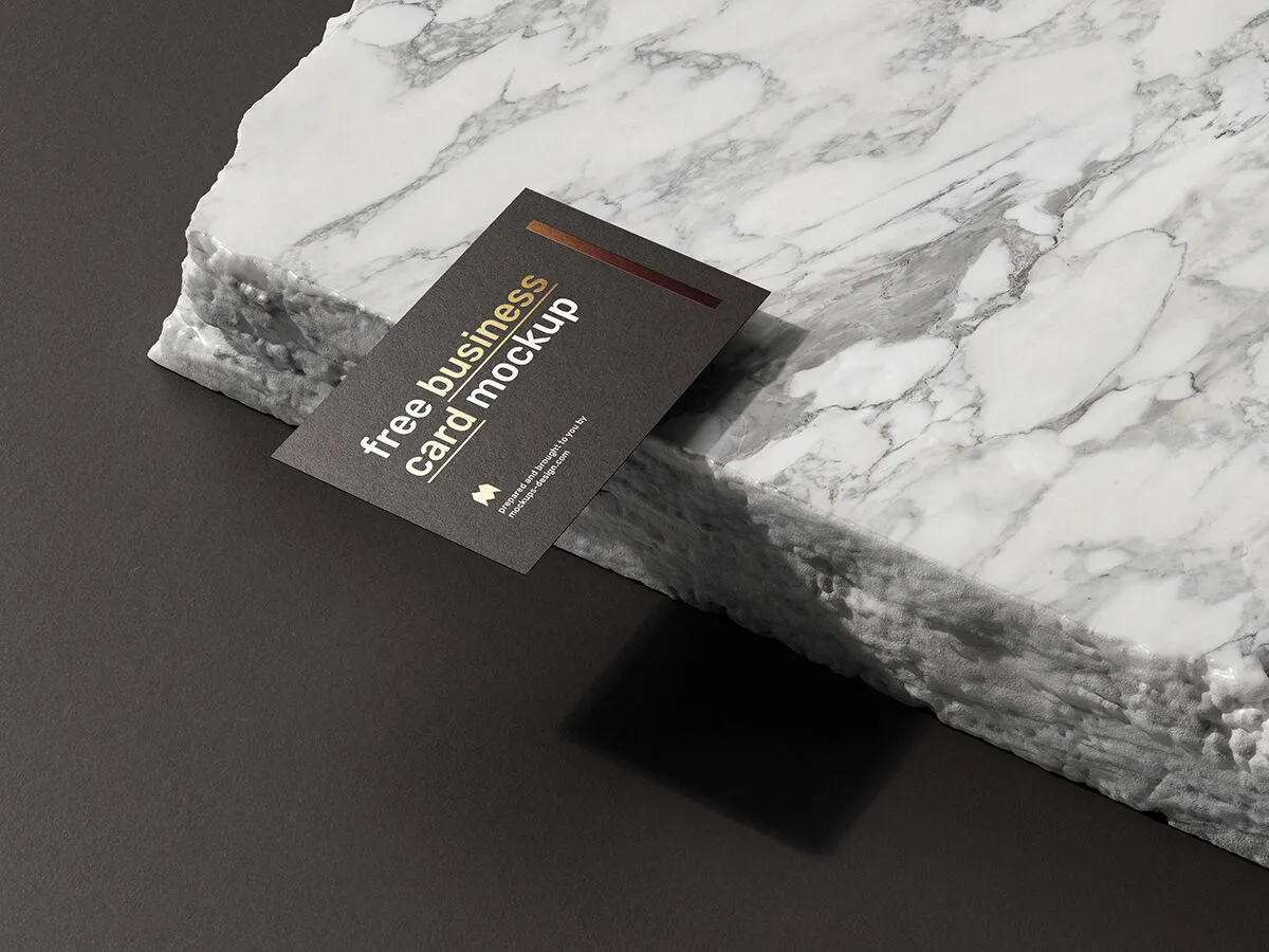 Showcase your business card designs with these three distinct mockups, each highlighting a premium quality card. The first mockup presents a top view of the card resting partially on the edge of a white marble rock. The second mockup features both the front and back views of two cards leaning against the rock. In the third mockup, you can see a front view of the card placed on the marble surface.