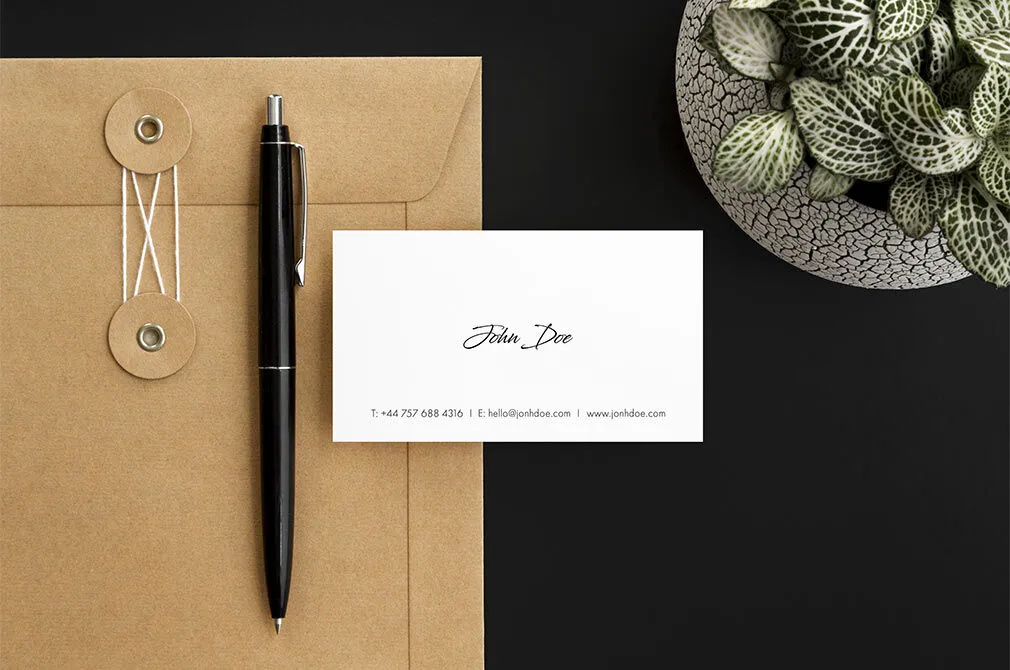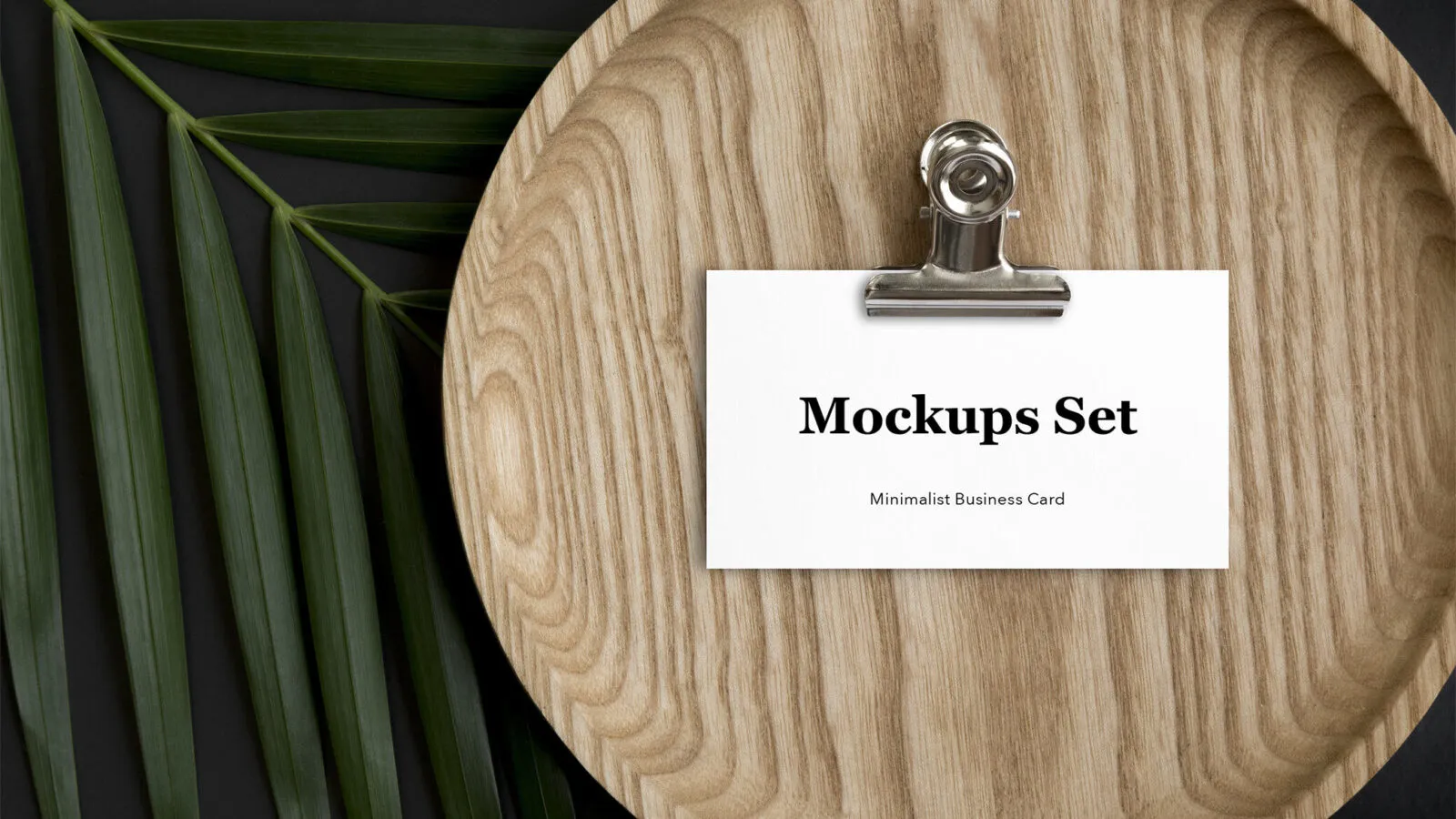 These three mockups provide a minimalist approach to showcasing business card designs in different overhead view scenes. Each mockup offers a unique setting to highlight your graphics. In one scene, a business card is held by a metallic paper clip on a wooden circle with a large green leaf nearby.