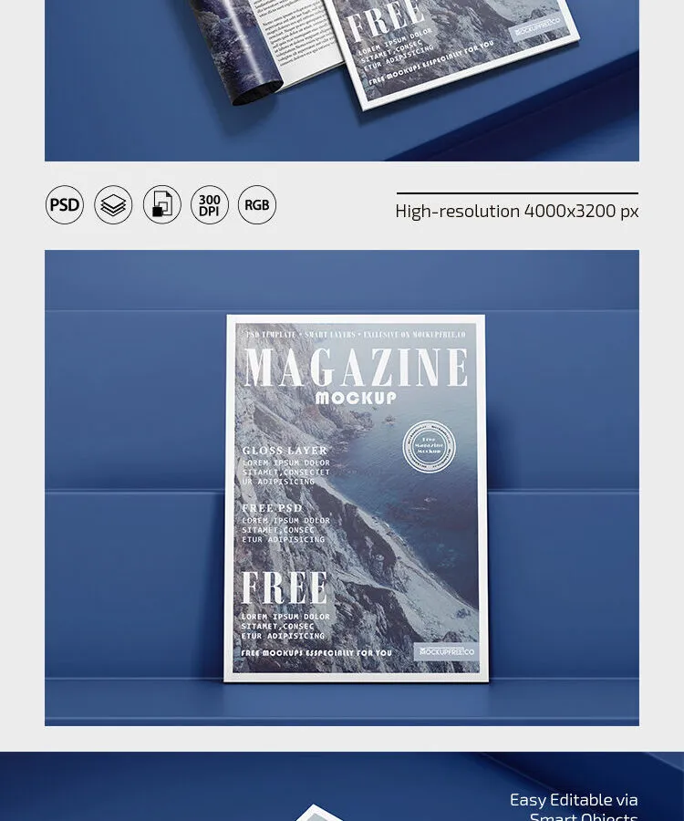 The second mockup presents a front view of a magazine standing against a blue background, providing a clear and straightforward angle. The third mockup offers a perspective view of several magazines stacked on each other. Choose the mockup that best suits your project requirements and easily download it for your use.