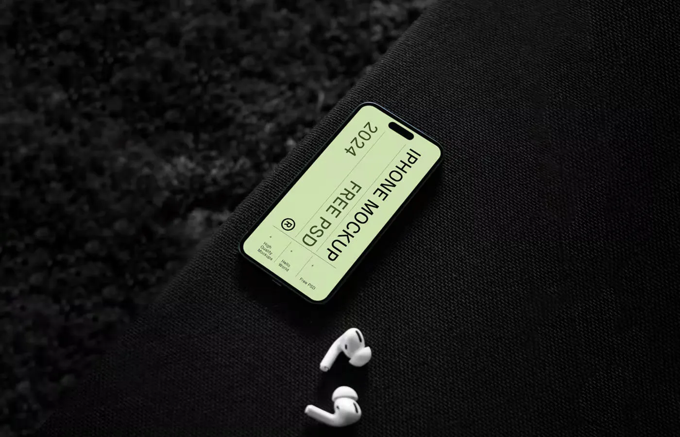 This iPhone 14 Pro mockup offers an elegant and stylish visual, providing a perfect setting to showcase your creative ideas and make a strong first impression. The mockup displays the device on a sofa in a dark setting, highlighting its sleek design.