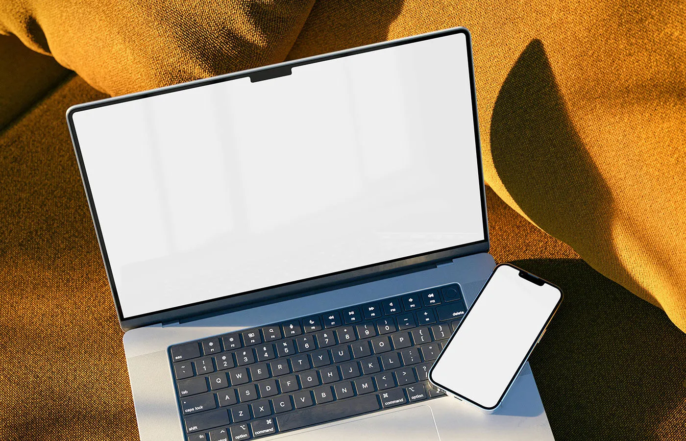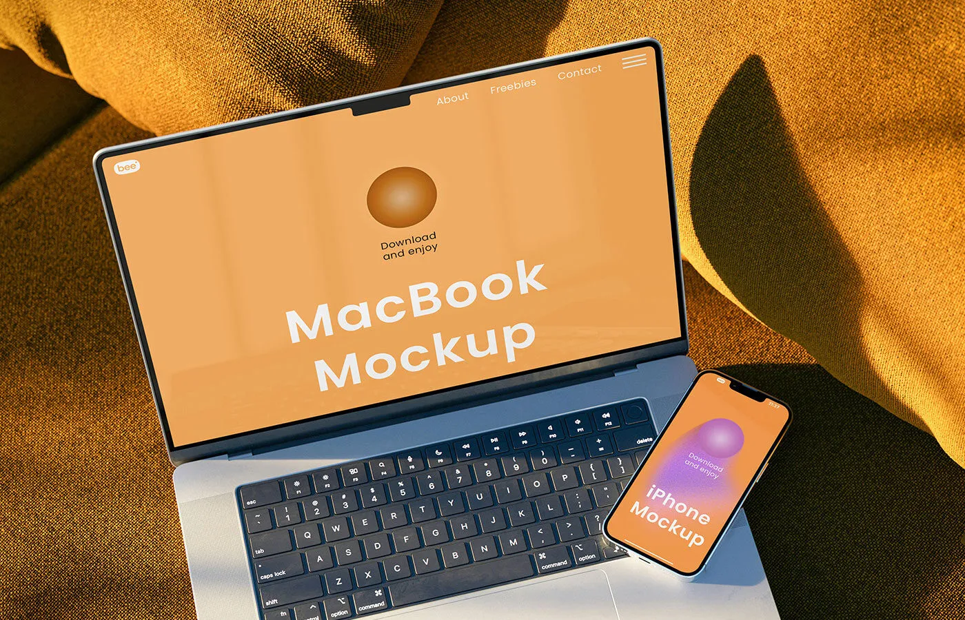 The setup includes an iPhone placed on a MacBook, enhancing the overall visual appeal. The soft texture of the background adds a cozy feel to the presentation. This distinctive mockup helps make your presentation stand out and leave a lasting impression.