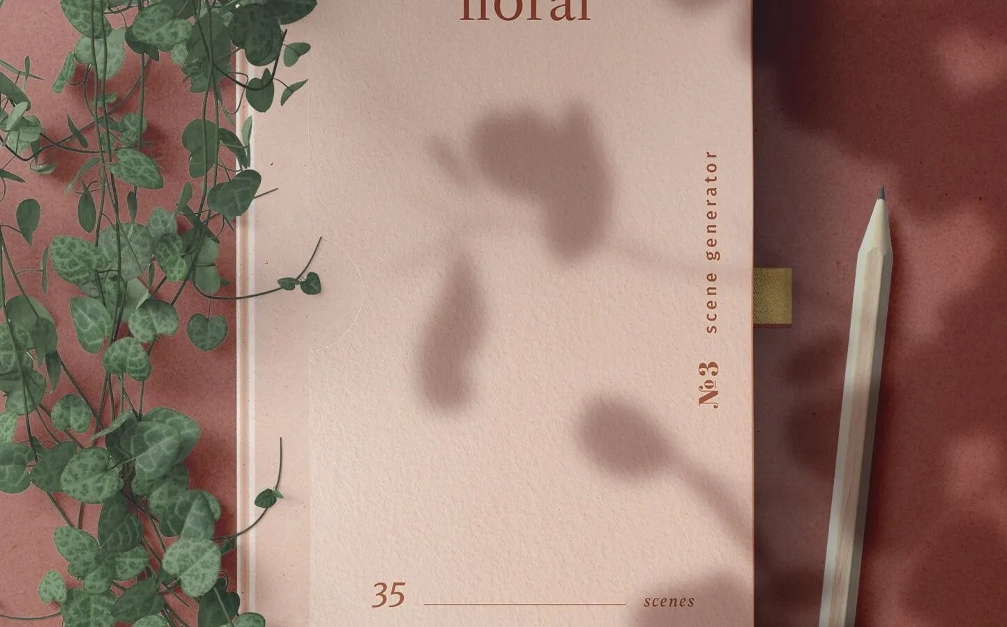 This top view book mockup features a realistic depiction of a hardcover book placed on a table. Accompanied by a pencil and a green plant that covers nearly half of the frame, the scene is completed with a subtle leaf shadow overlay on the other side. This setup provides a natural and visually appealing presentation.
