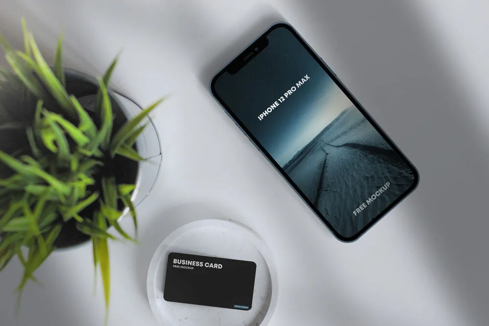 Top View of an iPhone 12 Pro Max and a Business Card Mockup