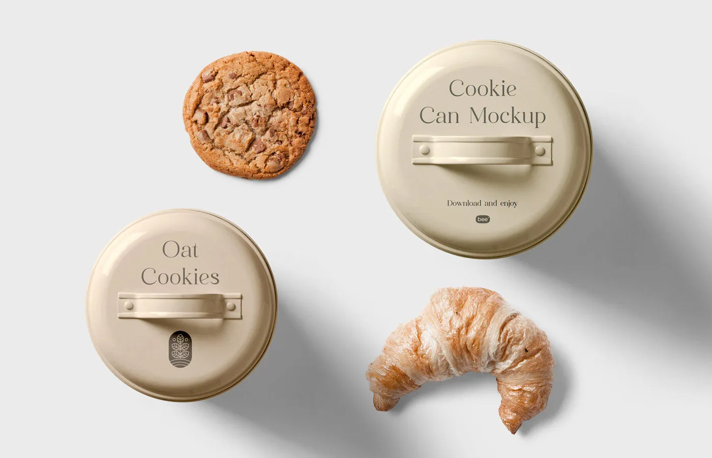 This mockup offers a top view of a cookie can alongside a croissant, perfect for showcasing homemade cookies or a renowned bakery’s creations. The minimal background highlights the sweets, while the high resolution ensures a clear and detailed presentation. The mockup allows for customizable features, making it versatile for different design needs.
