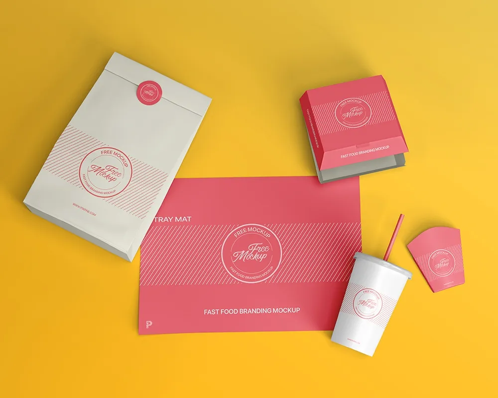 If you run a food-related business or take an opportunity to assemble the brand design of a cafeteria or a fast food restaurant, never neglect today’s . Here, a top view of a fast-food comes up with a soda cup, burger box, paper bag, and fries packaging to implement your ideas, logo, and website with a cool font which we also give away at RB.