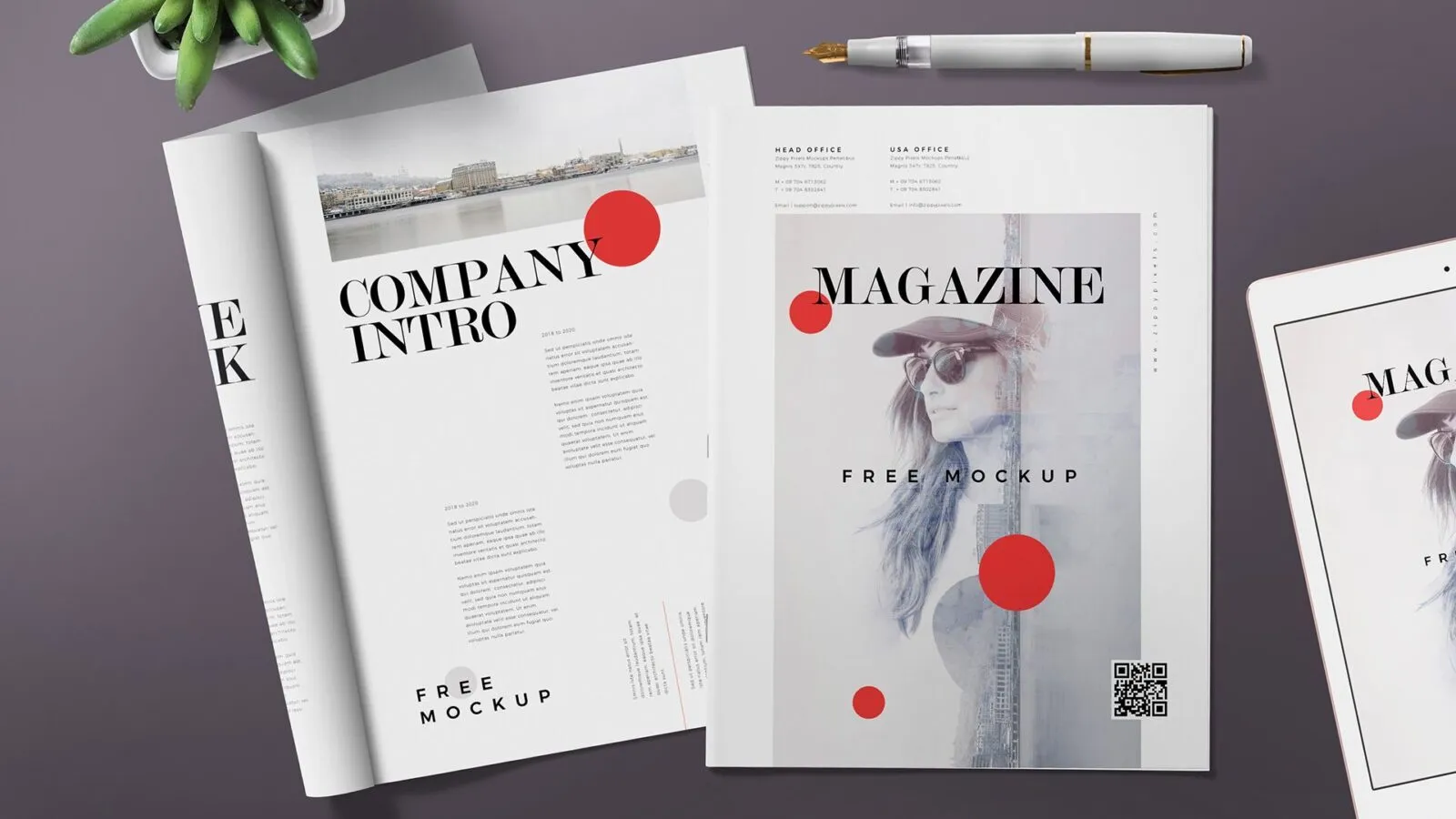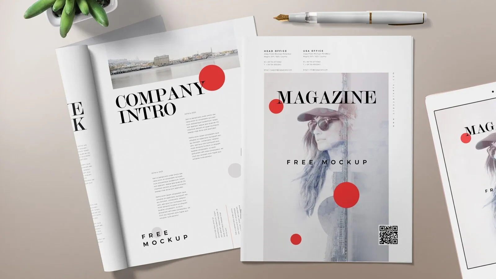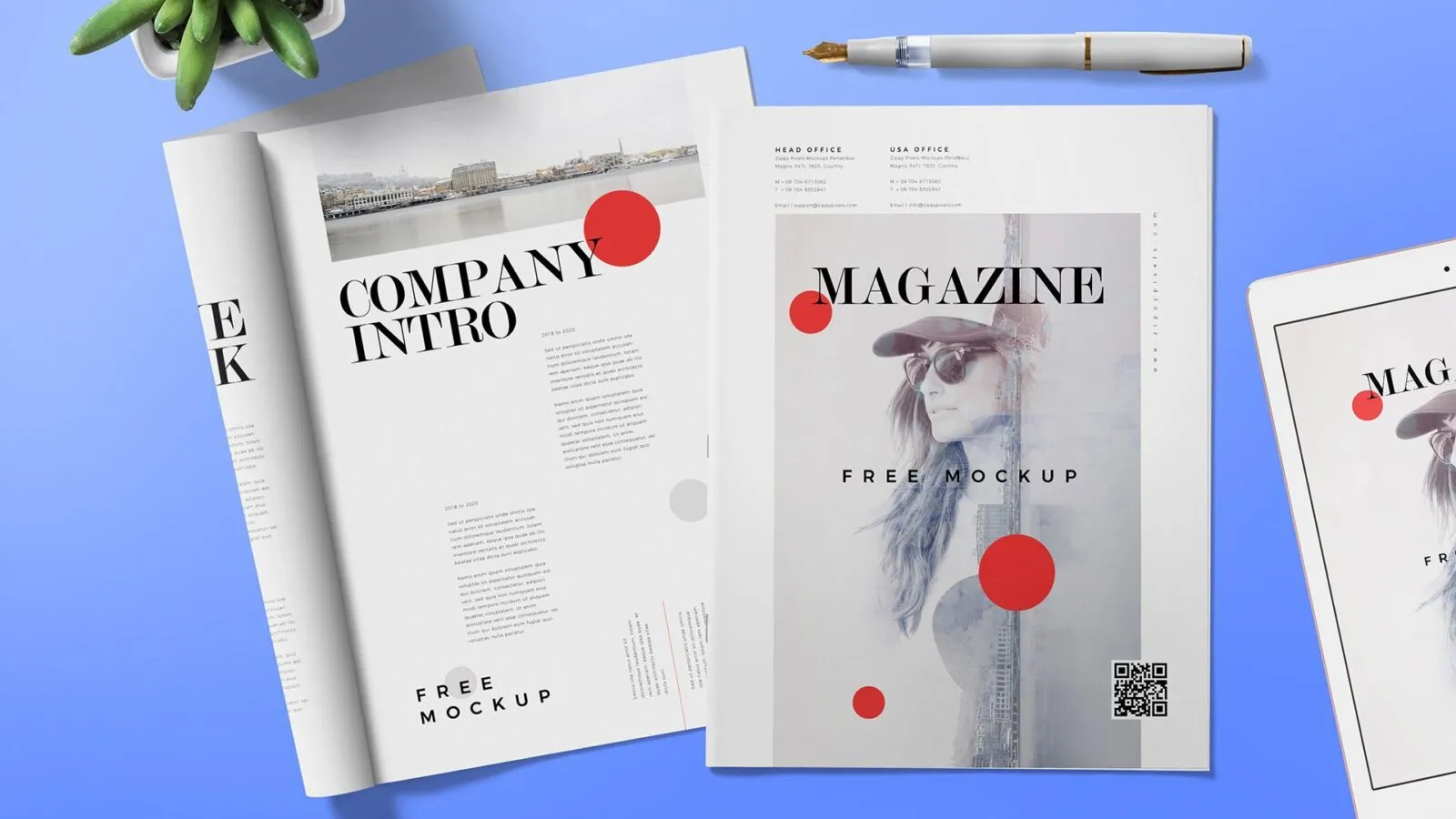 Top View of Open Folded Magazine and iPad Pro Mockup