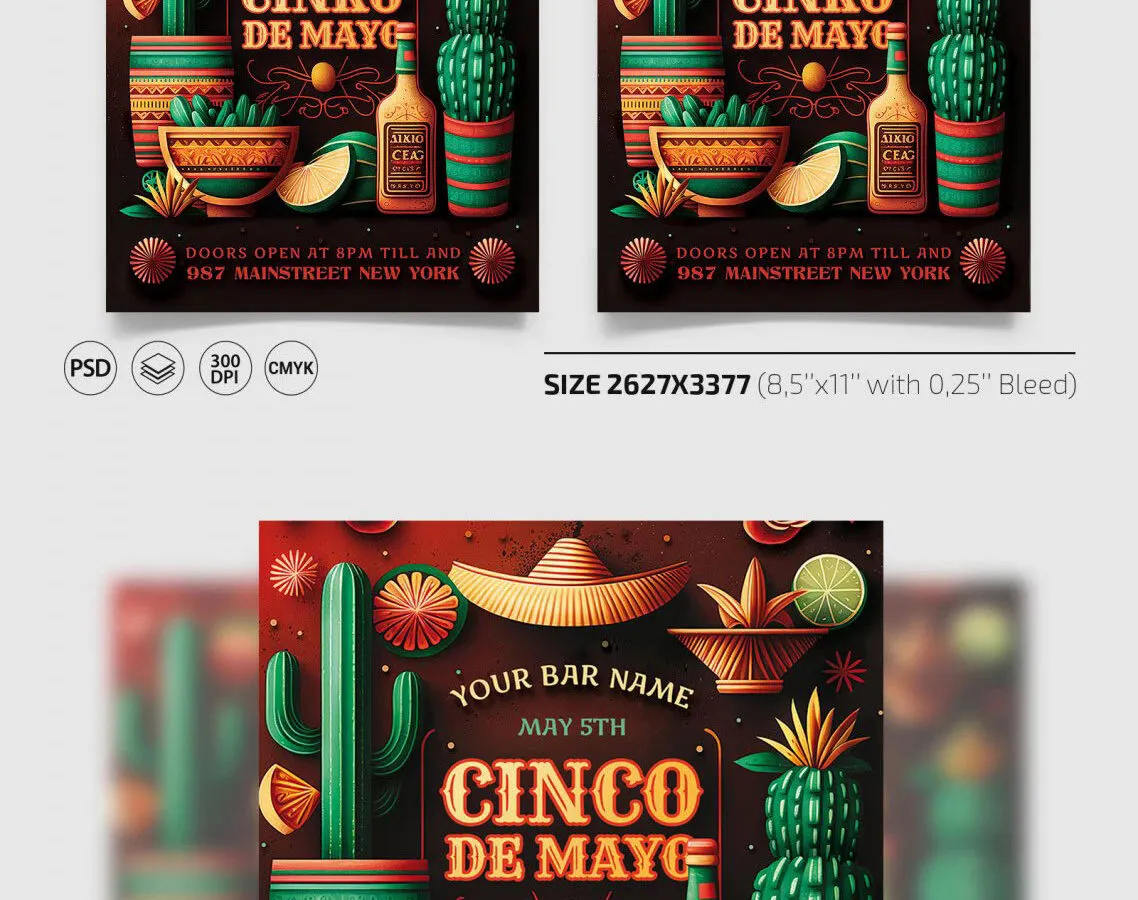 Invite your followers to celebrate Cinco De Mayo with this vibrant and festive flyer design. The various elements of this template capture the lively spirit of the holiday, making it perfect for sharing on social media or for printed invitations.