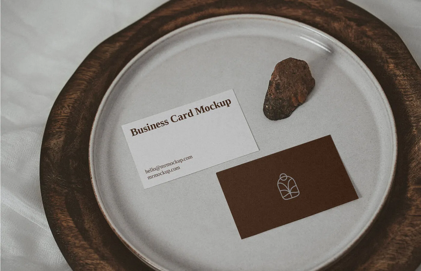 You can showcase your brand, and design, in style with the help of this fantastic business card on a plate mockup! It includes 2 cards besides a tiny rock on a plate. You don’t have to worry if you would like to display 2 designs or even the back or front of your card.