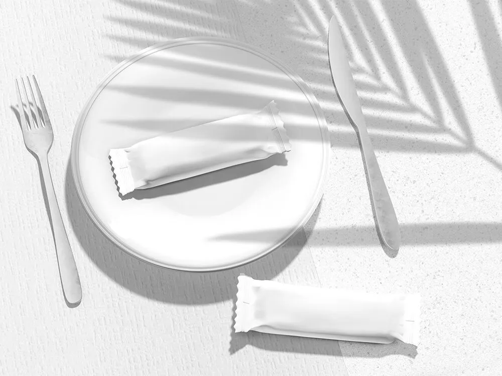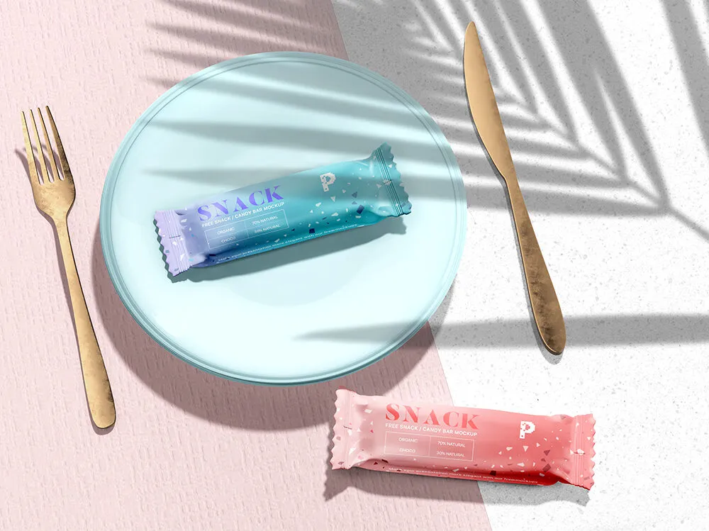 You notice two candy or snack bars, one on a plate with a knife and fork beside it, the other on the two-toned surface. The amazing shadow on the wall and the rest of the image make it look super realistic. Download, insert your design, and change the background and colors by using smart layers.