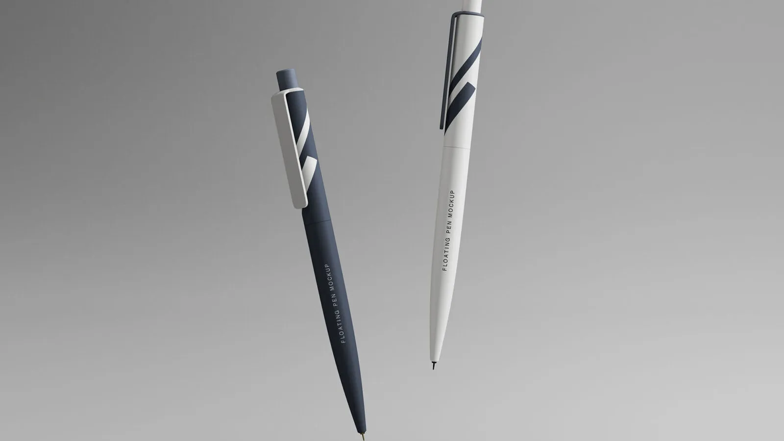 Two pens are floating on air in the present mockup. One is white with dark stripes, and the other is a dark color with white stripes. There is a brand on the front part of the pens that you can easily replace with your terrific design.