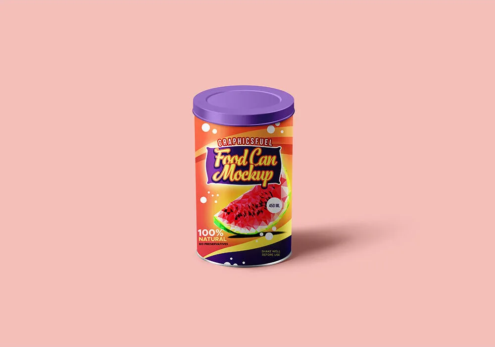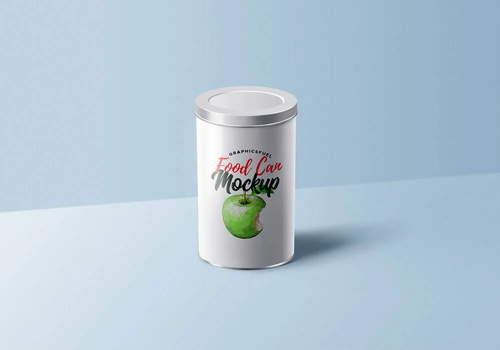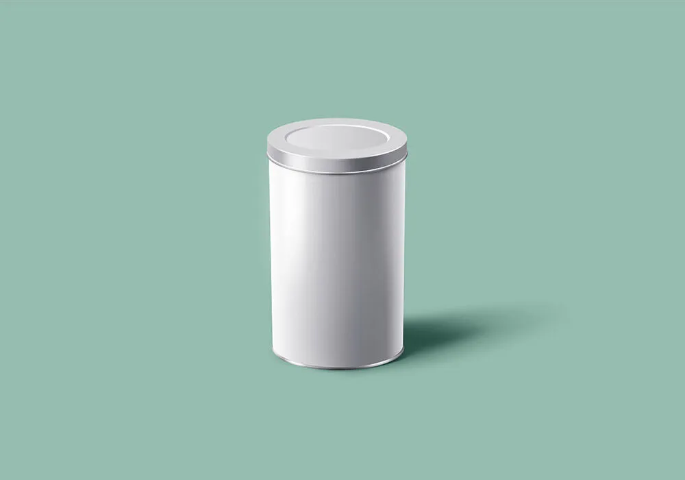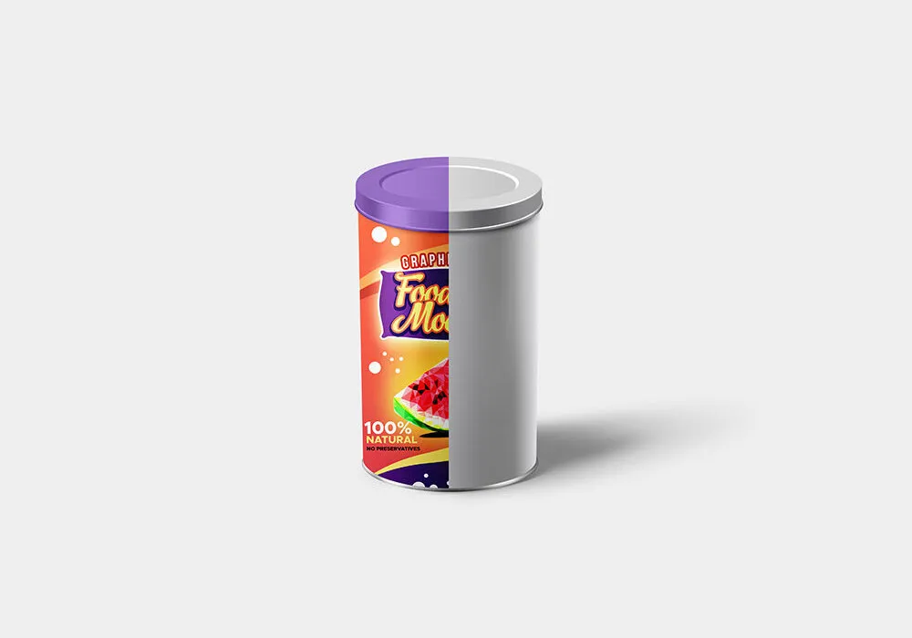 This product features two mockup files showcasing a food can tin with a lid, ideal for presenting your packaging designs. Each file includes a standing can tin, allowing you to view both the front and the lid area.