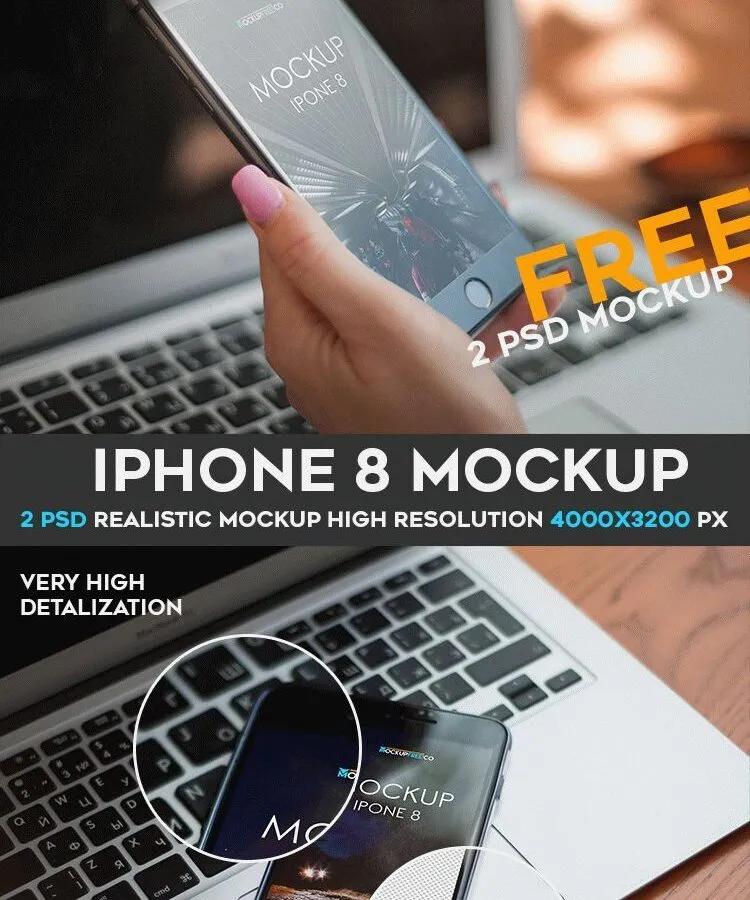 The first scene features a woman’s hand holding an iPhone 8 in front of a laptop, while the second scene shows an iPhone 8 resting on a laptop. These scenes offer a modern and realistic way to present your digital items. Simply insert your images and text to achieve a seamless and impressive result.