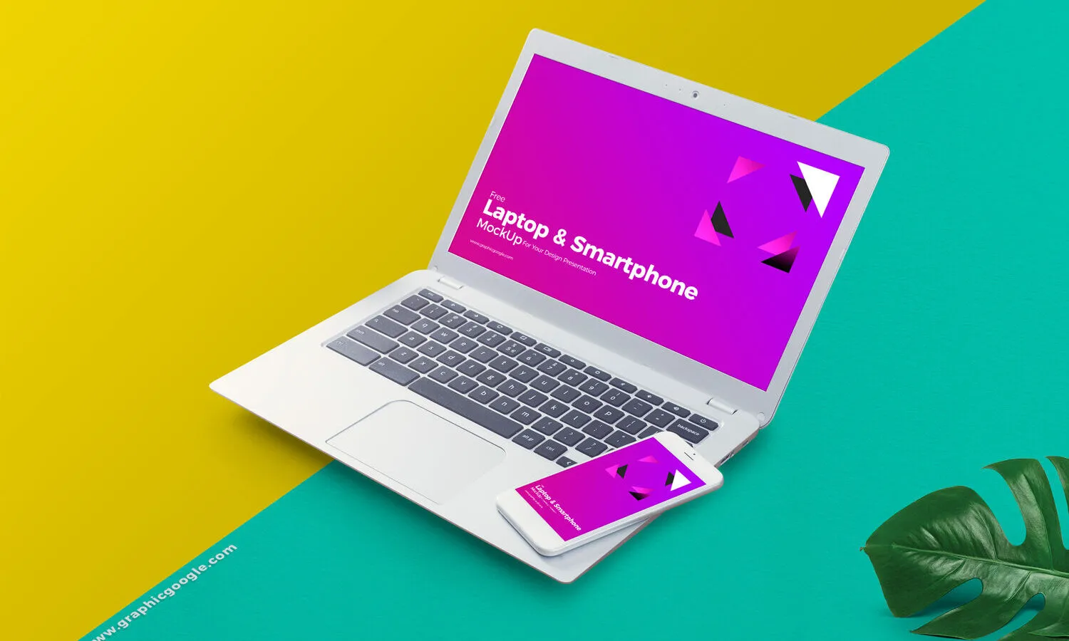 The scene is designed with a split background and includes a Swiss cheese plant leaf in the bottom left corner, adding a natural touch to the layout. These mockups are easy to use and will help you create a visually appealing presentation that captures your audience’s attention.