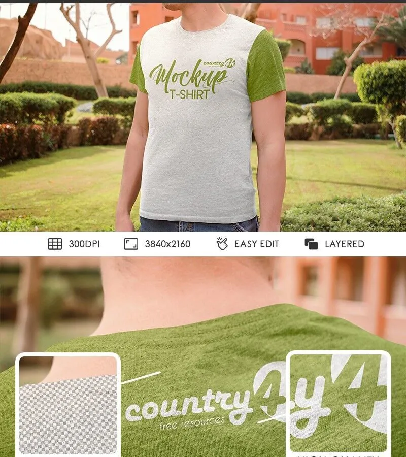 Two files are provided in today’s freebie, which allows you to exhibit your apparel design in an ultra-realistic setting. A man model is standing before a massive house with lawns and trees in the background. This man is wearing a T-shirt which is the item ready to showcase your apparel designs.