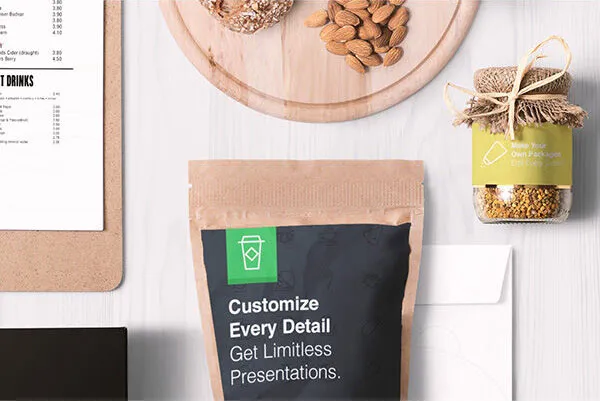 After looking at this mockup, you would consider yourself in a modern kitchen because it exhibits two complete and realistic sets of food packaging. The offered items are jars, bottles, packs, business cards, A4 paper on a clipboard, and a few cookies, dry fruits, and teabags to decorate this scene.