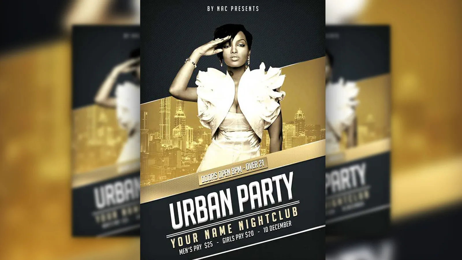 The Urban Music Club Flyer Template Featuring Faded Buildings is designed to effectively promote concerts, parties, nightclubs, and various events. This versatile flyer is divided into three sections with two narrow diagonal lines, offering a unique layout.