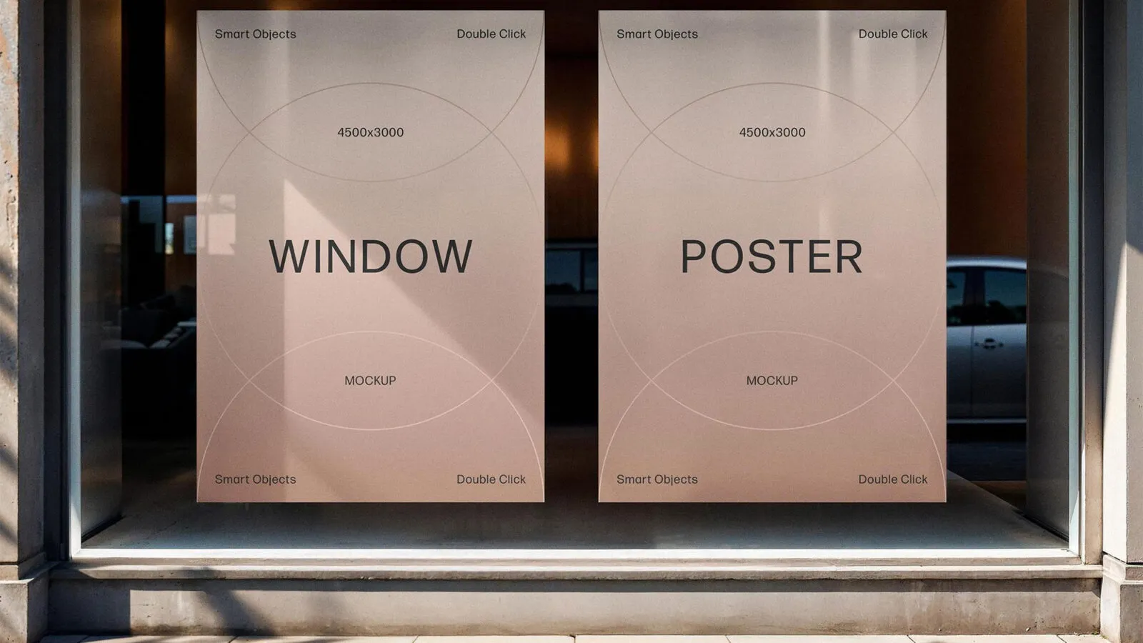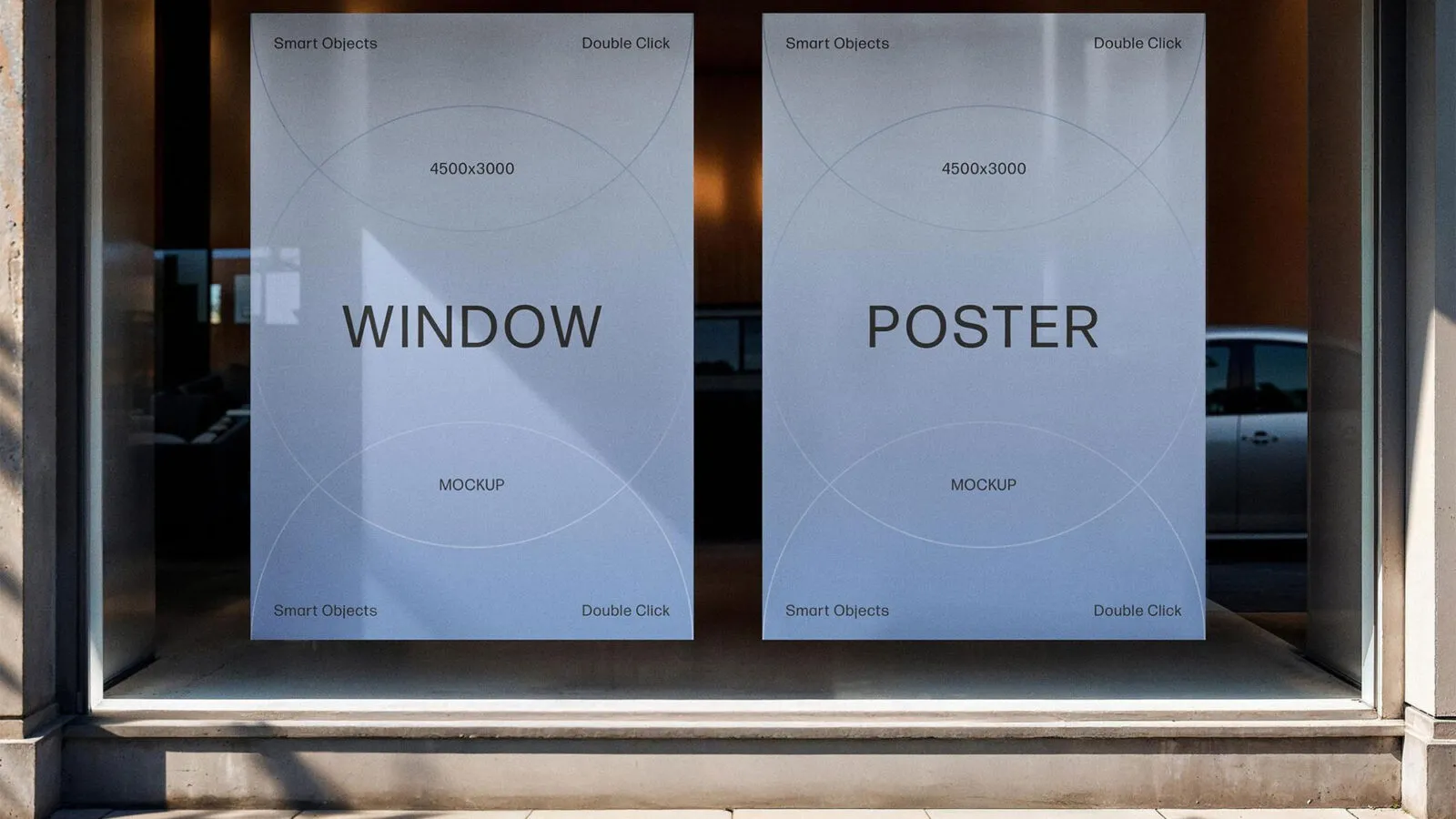 Transform any retail space into a captivating visual experience with this window poster mockup. This sleek PSD file showcases a series of tall, elegant posters arranged in a modern store window, creating a sophisticated and cohesive brand presentation. Effortlessly insert your designs using smart object layers for a seamless application with realistic reflections and upscale ambiance.