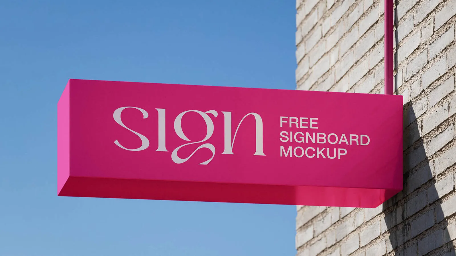 Electrify your storefront branding with this vibrant . This eye-catching PSD file showcases a dynamic, pink sign against a brick wall, creating a striking contrast that commands attention. Easily apply your custom text or logo through smart object layers to achieve a seamless, painted look with authentic texture and brilliant color saturation.