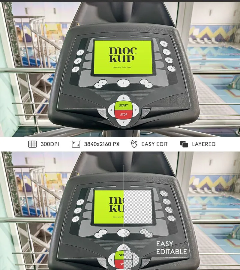 Ideal for gyms, equipment retailers, and health blogs, this mockup promotes an active lifestyle. Download this free resource to create compelling visuals for your website or ads, making the treadmill an inviting centerpiece for any home or commercial space.