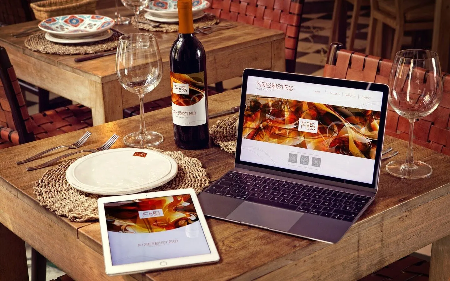 This wine bottle mockup, featuring an iPad and MacBook, offers a realistic and visually appealing way to showcase your designs. The scene includes a bottle of wine on a table alongside a MacBook, iPad, and glasses, creating a sophisticated setting for your presentation.