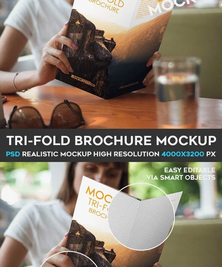 Here’s a template that can grab your attention for creating a lifelike and Photoreal presentation including a human item. The template features a woman reading a tri-fold brochure that you can customize according to your taste. As said, the brochure has three panels. In this scene, one panel is folded inside yet you have enough workspace for adding various things.