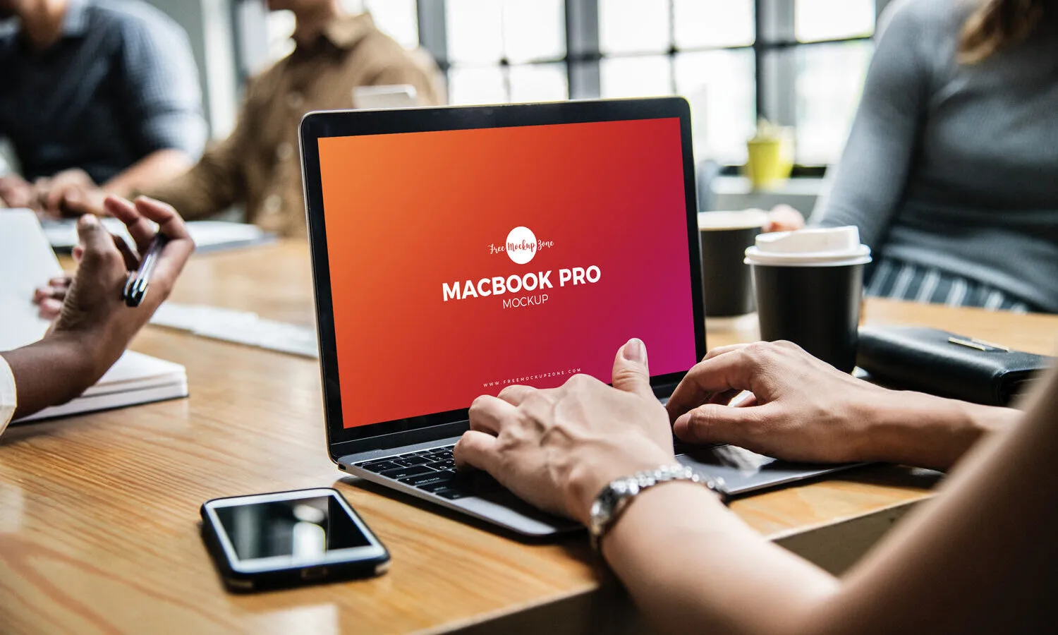 This mockup features a MacBook Pro placed on a wooden office desk, with a woman’s hands on the keyboard. The setting includes people sitting around the table, creating a realistic and engaging scene.